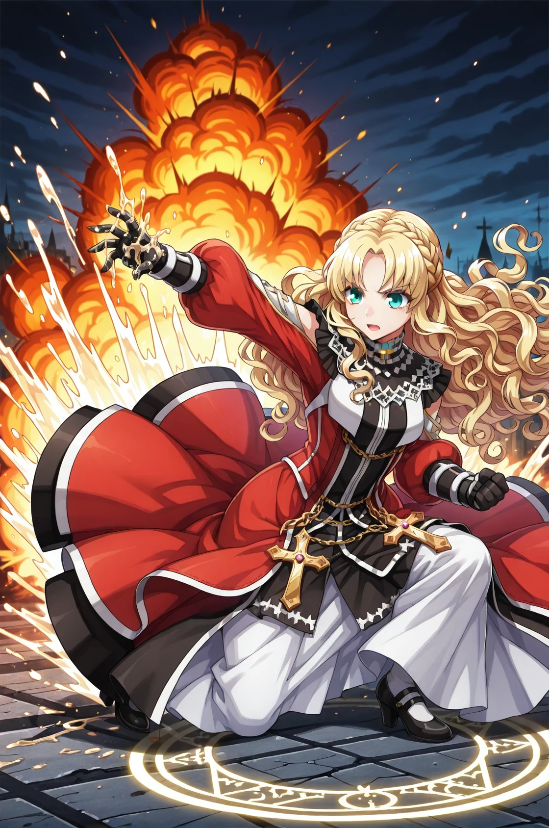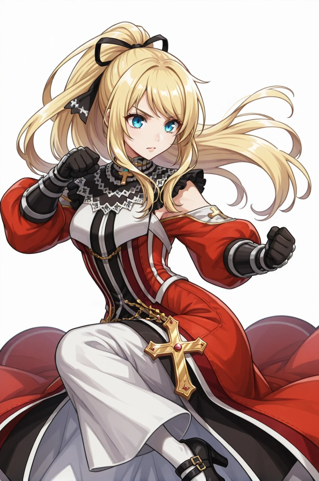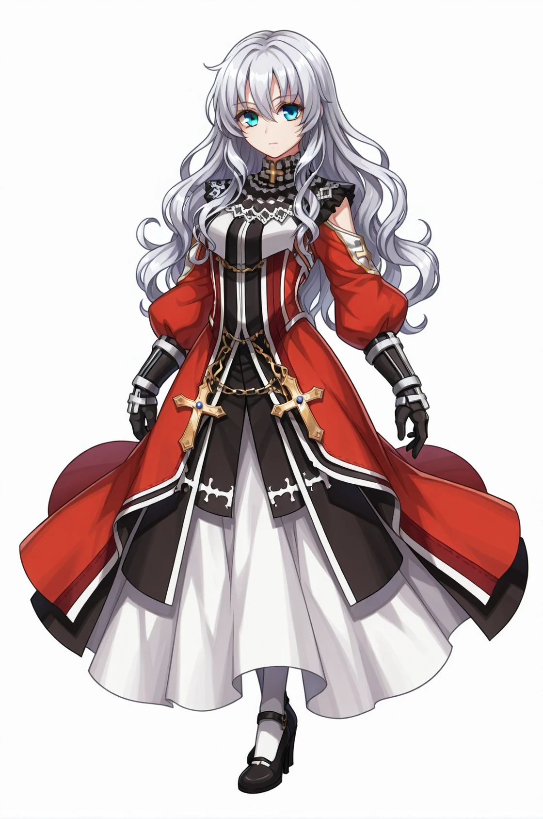 prompt: inquisRo, black gauntlets, lace, cross, cross necklace, puffy long sleeves, long red dress, detached sleeves, long skirt, white legwear, black high heels
