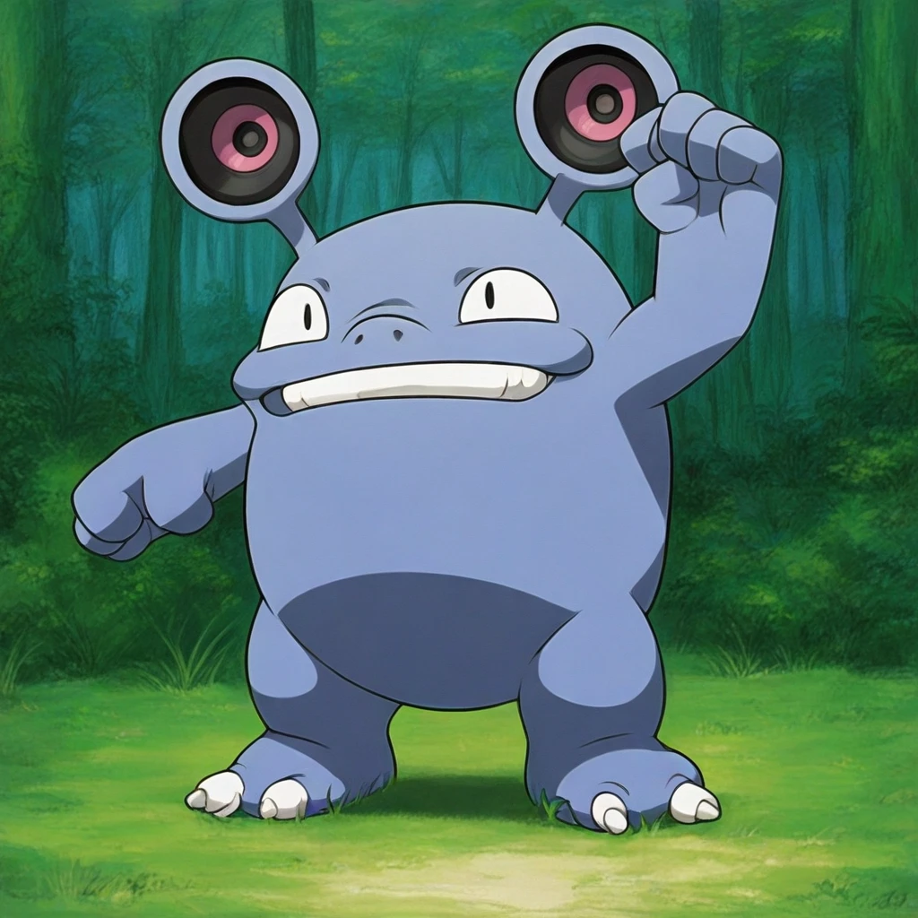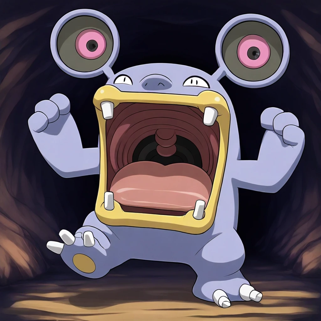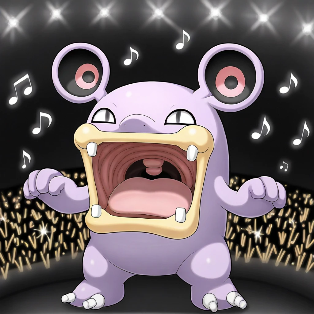 Loudred_Pkmn, blue fur, white eyes, four teeth, tan lips, circular ears, red circle in ears, two toenails