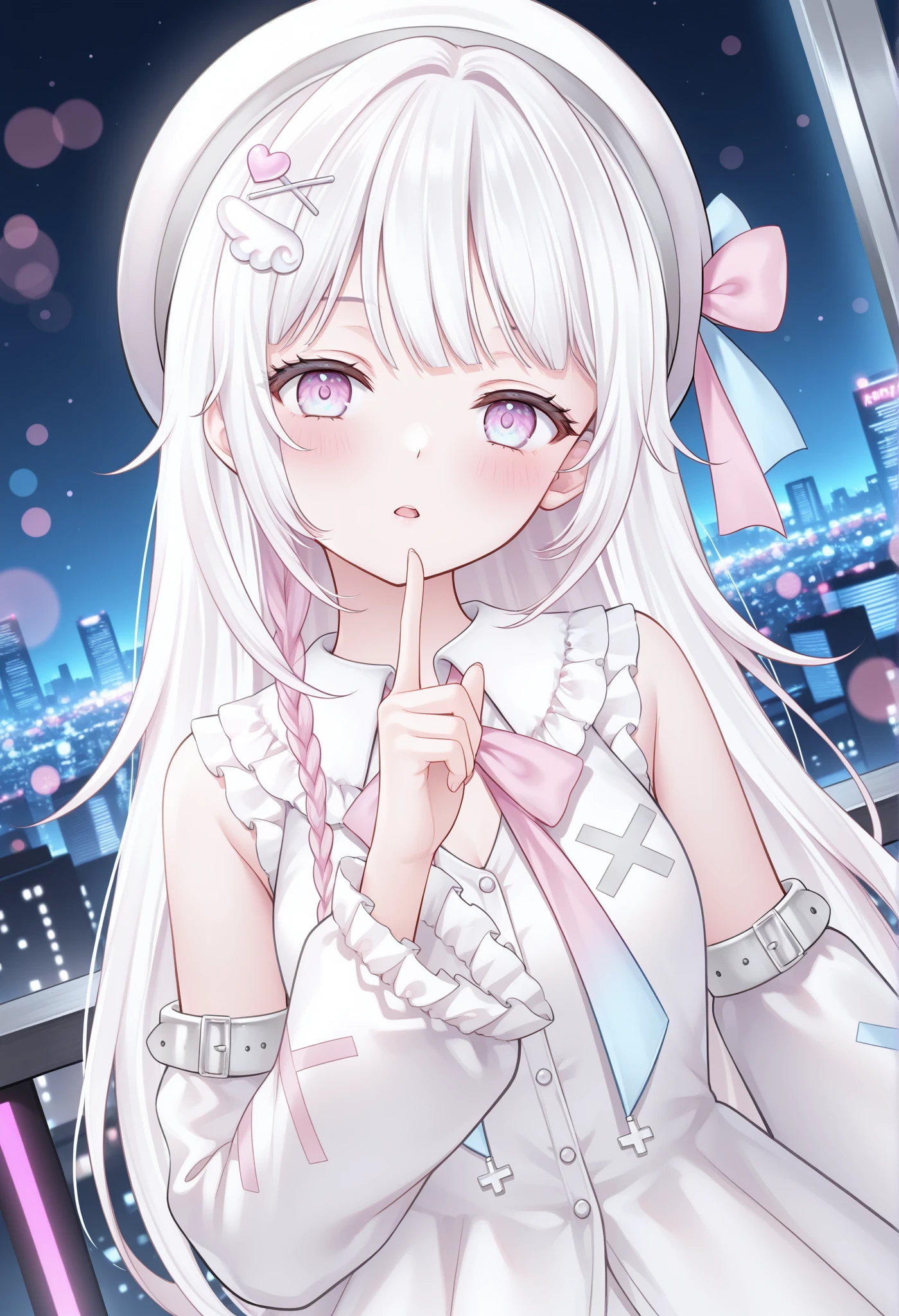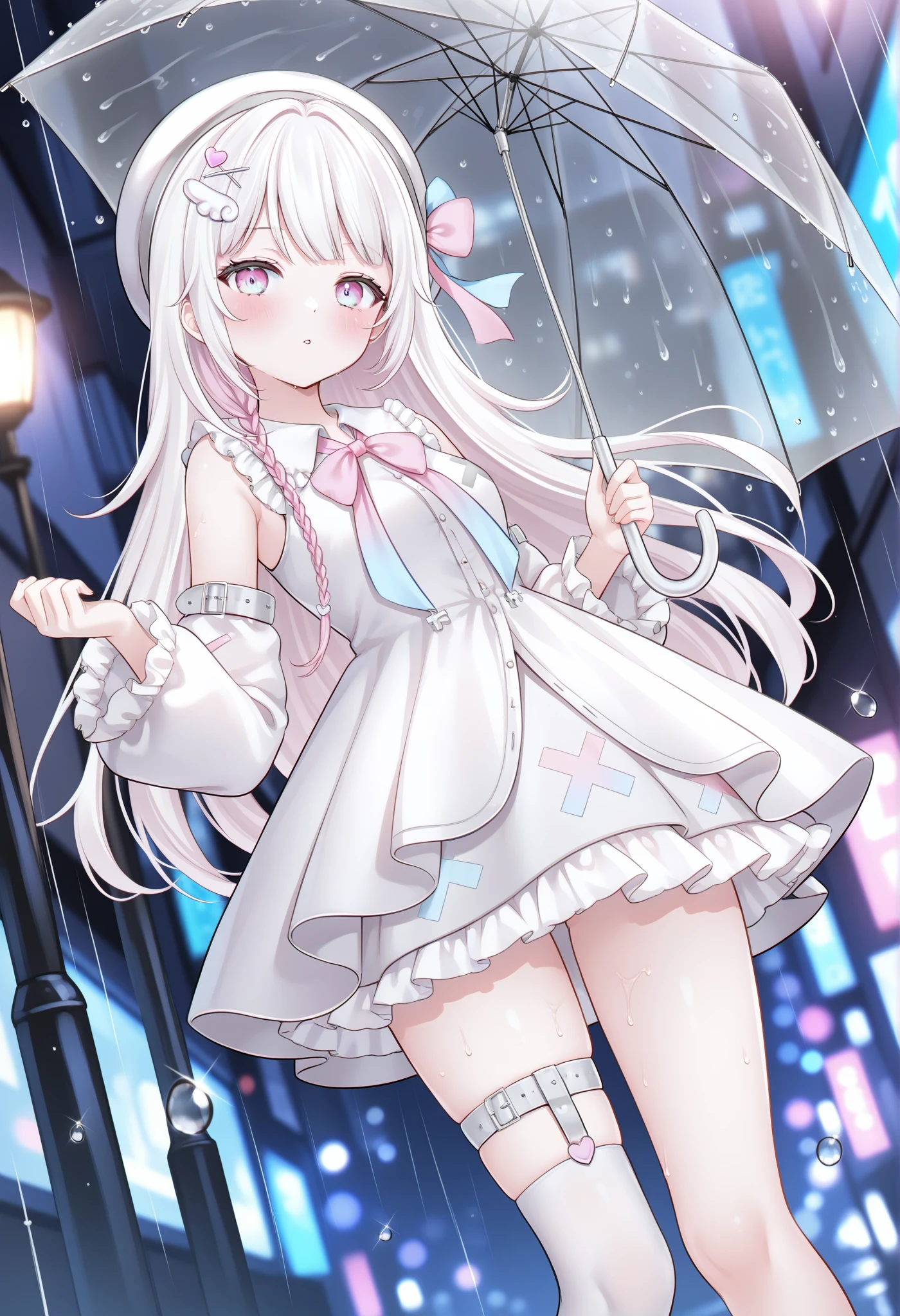 frills, virtual youtuber, white hair, long hair, bow, hair ornament, beret, heart hair ornament, sleeveless, pink eyes, multicolored eyes, (blue eyes:0.55), pink bow, ribbon, white dress, bowtie, frilled dress, single thighhigh, white thighhighs, x hair ornament, thigh strap, frilled sleeves, hairclip, wing hair ornament, detached sleeves, uneven legwear, white hatRecommended Weight (推荐权重):