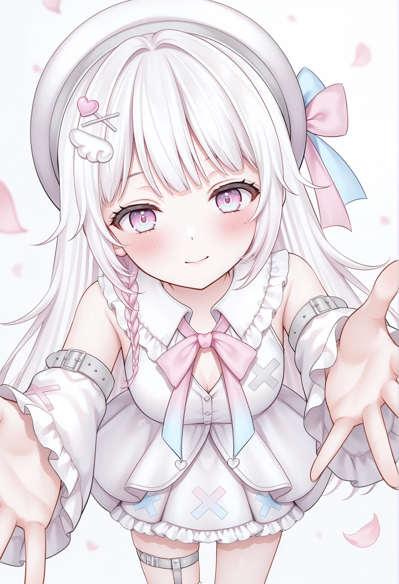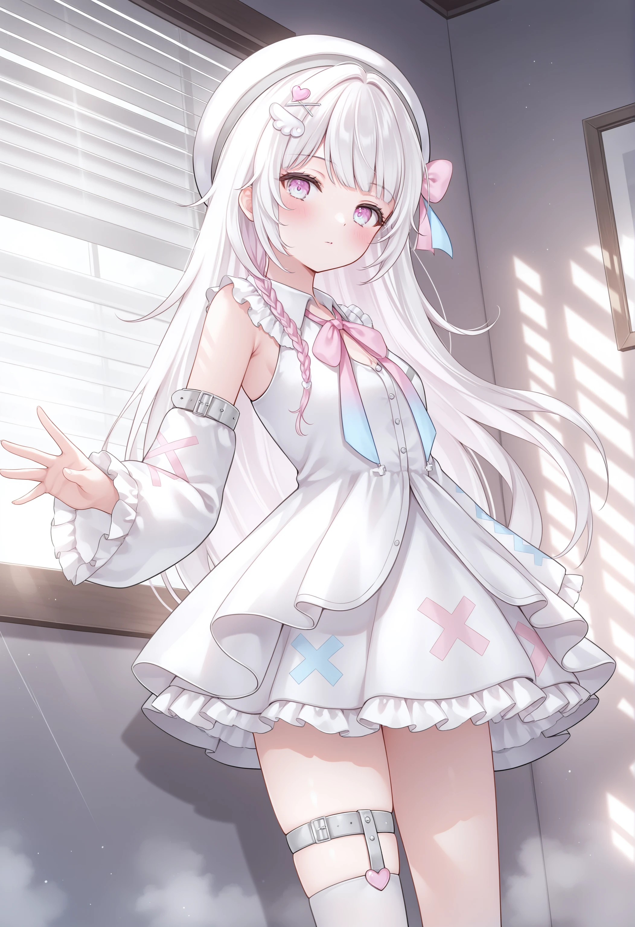 frills, virtual youtuber, white hair, long hair, bow, hair ornament, beret, heart hair ornament, sleeveless, pink eyes, multicolored eyes, (blue eyes:0.55), pink bow, ribbon, white dress, bowtie, frilled dress, single thighhigh, white thighhighs, x hair ornament, thigh strap, frilled sleeves, hairclip, wing hair ornament, detached sleeves, uneven legwear, white hat