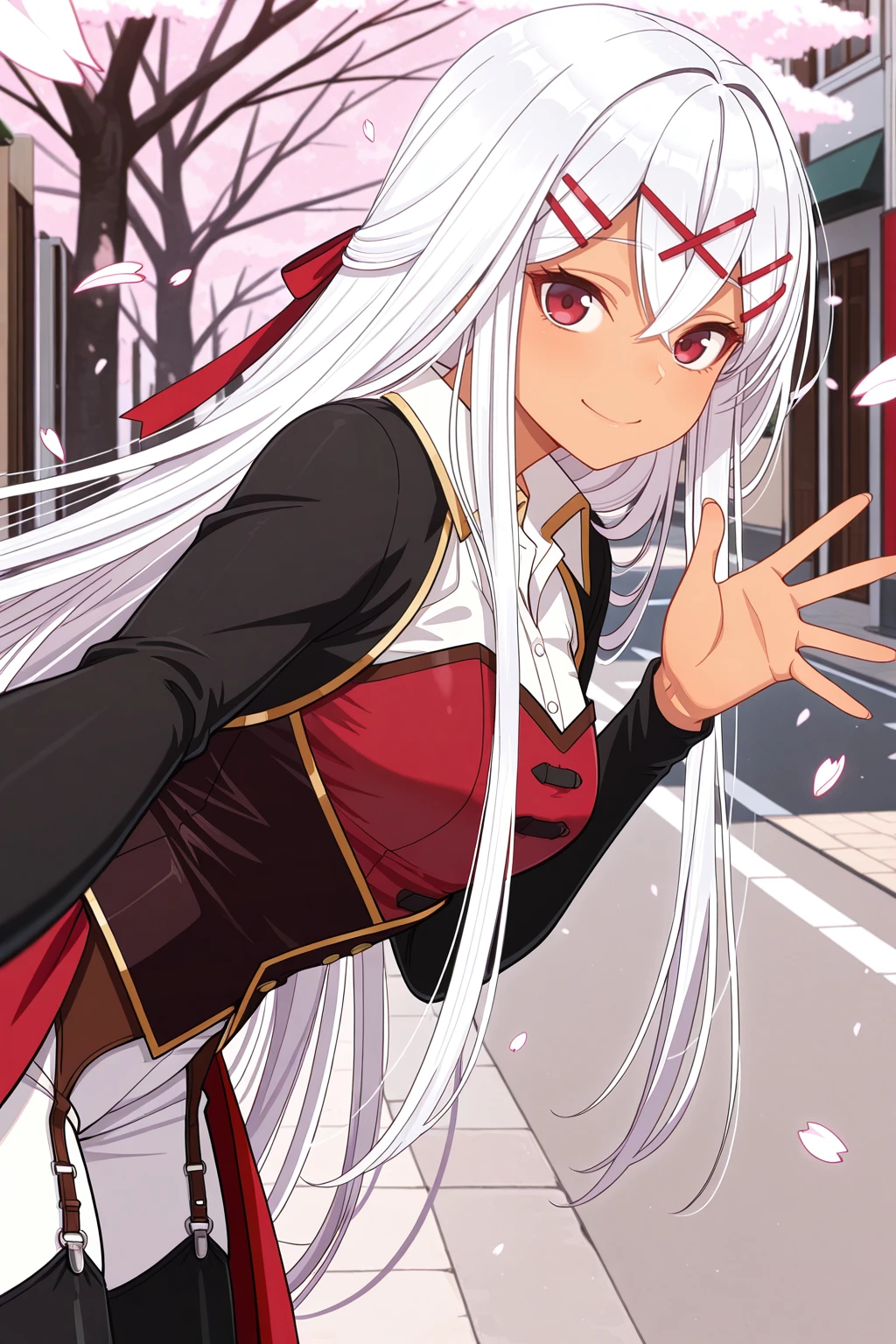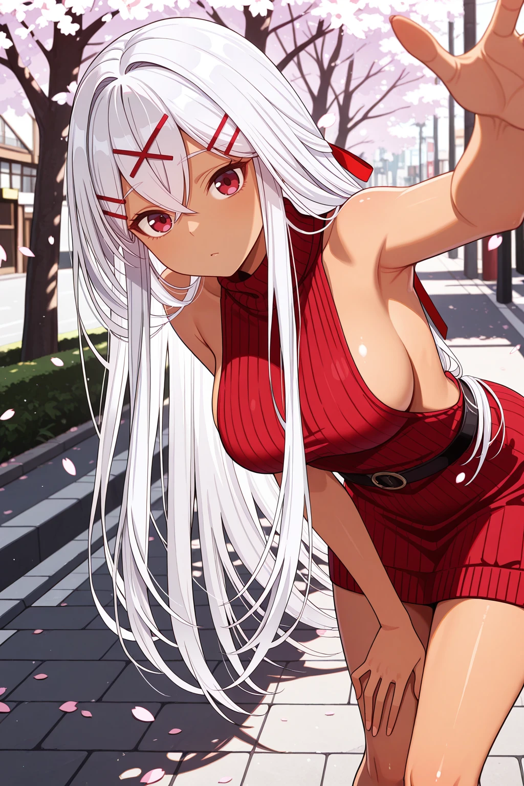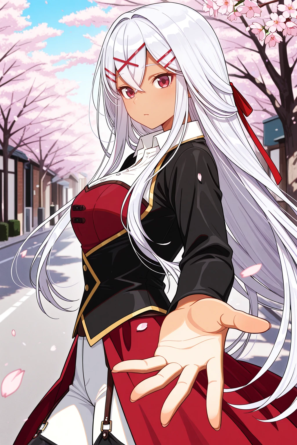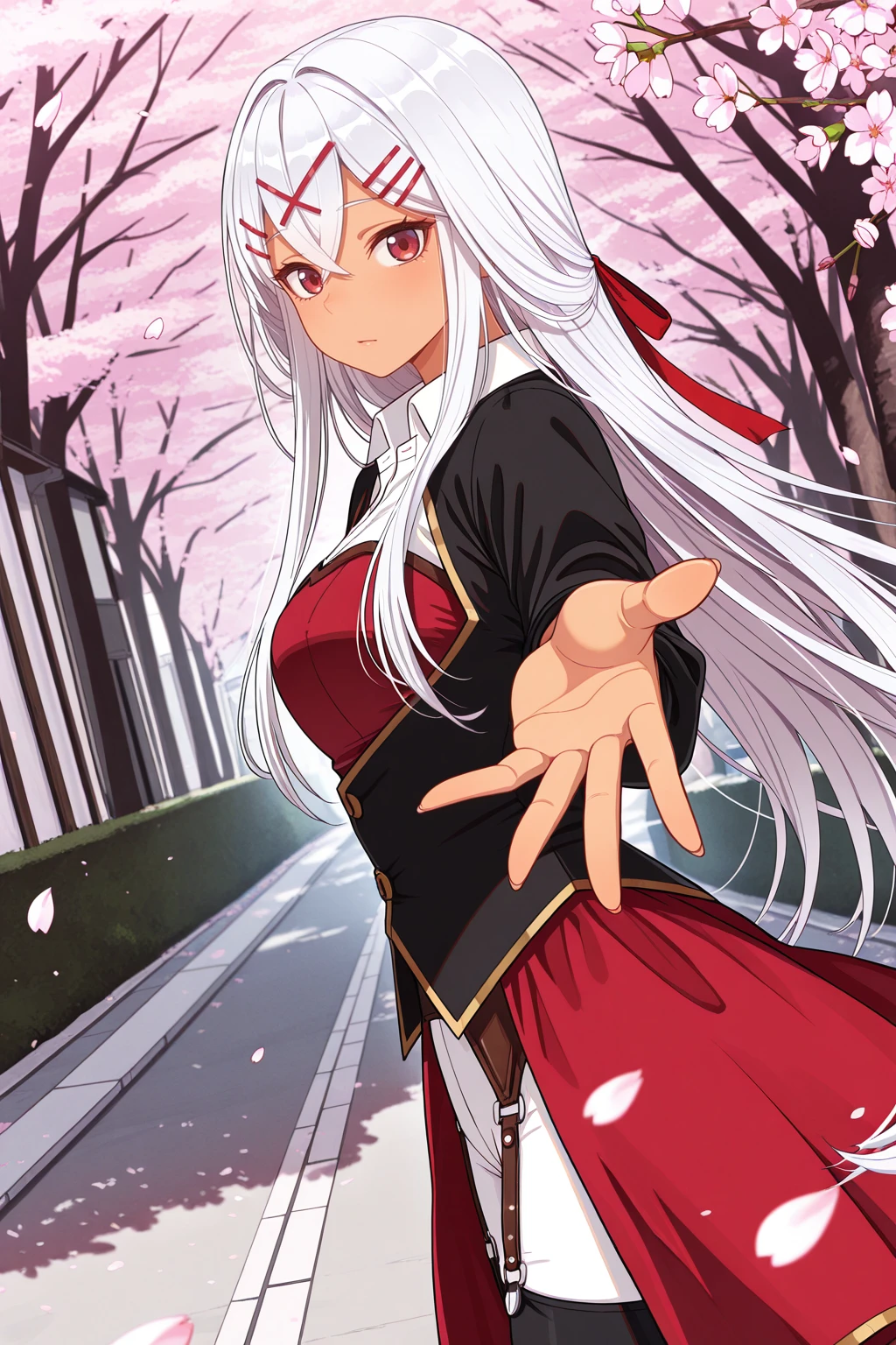 yulishia, crossed bangs, dark-skinned female, hair between eyes, hair ornament, hairpin, white hair, red eyes, very long hair๐ข๐๐๐ณ๐ถ๐: