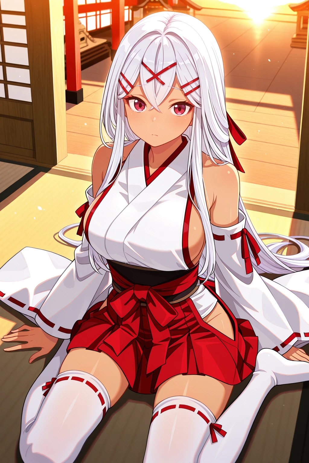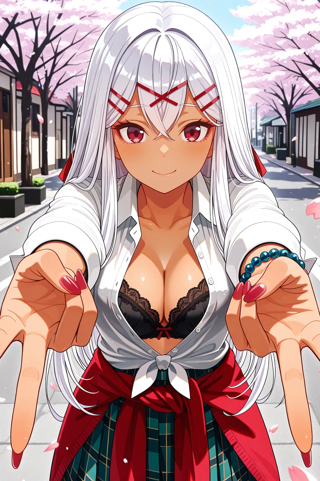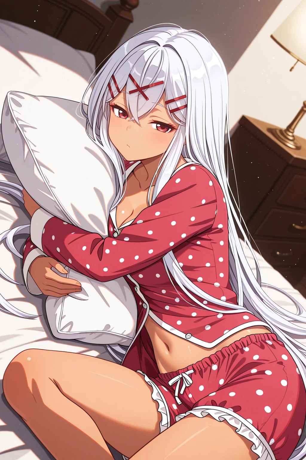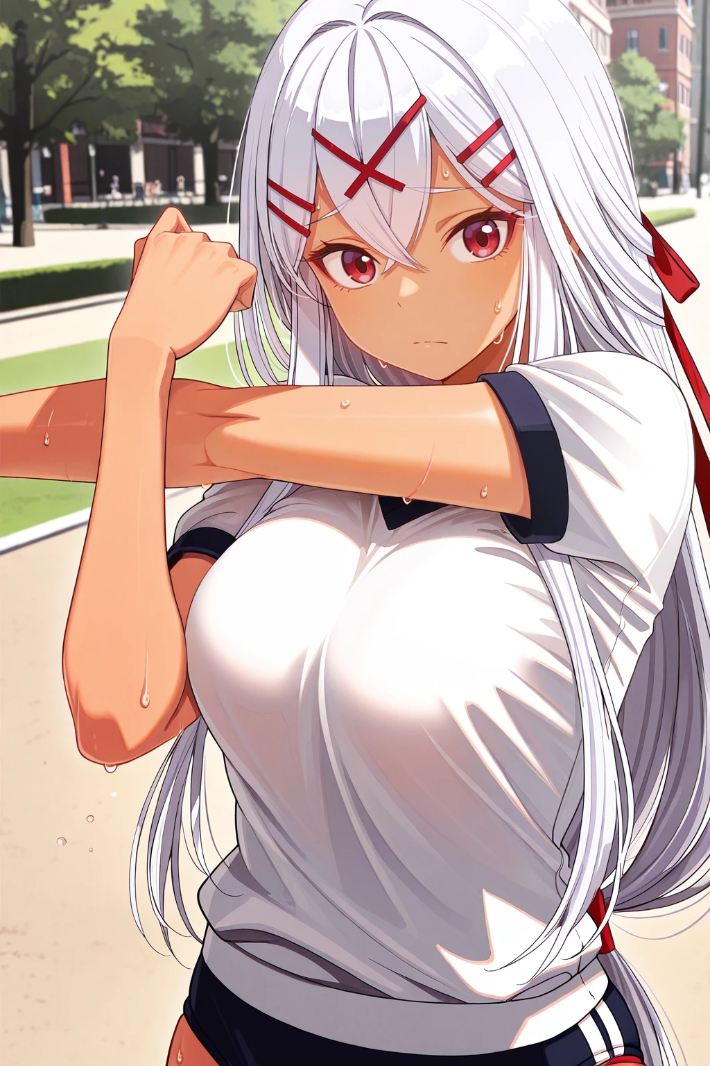 yulishia, crossed bangs, dark-skinned female, hair between eyes, hair ornament, hairpin, white hair, red eyes, very long hair๐ข๐๐๐ณ๐ถ๐:
