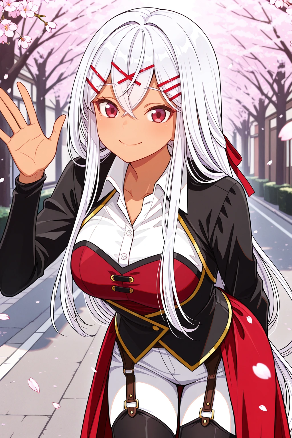 collared shirt, jacket, partially butonned, white pants, white shirt, garter, black detached legwear, red top, red waist capeDescription
