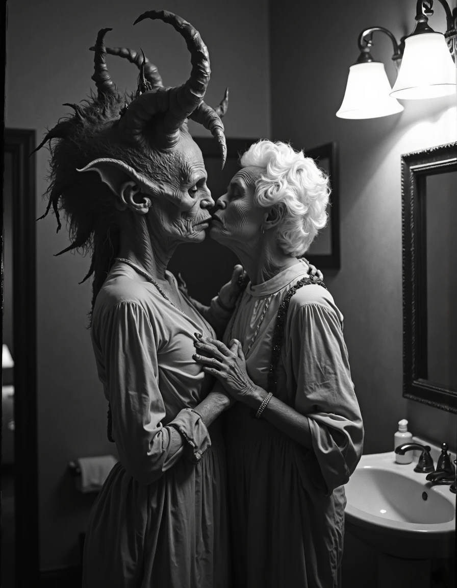 Monochrome/greyscale elderly woman in a bedroom/bathroom/livingroom. However you can totally prompt it to work outside of those paramaters easily. It just what it was trained on and works best as.
