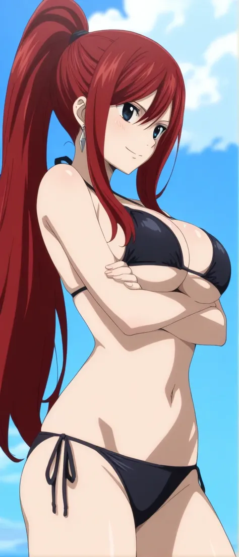1girl, long hair, hair over one eye, ponytail, red hair, brown eyes, big breasts,