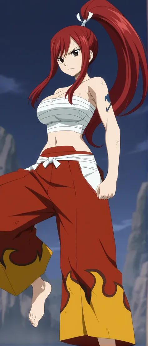 navel, barefoot, bare shoulders, chest sarashi, red pants