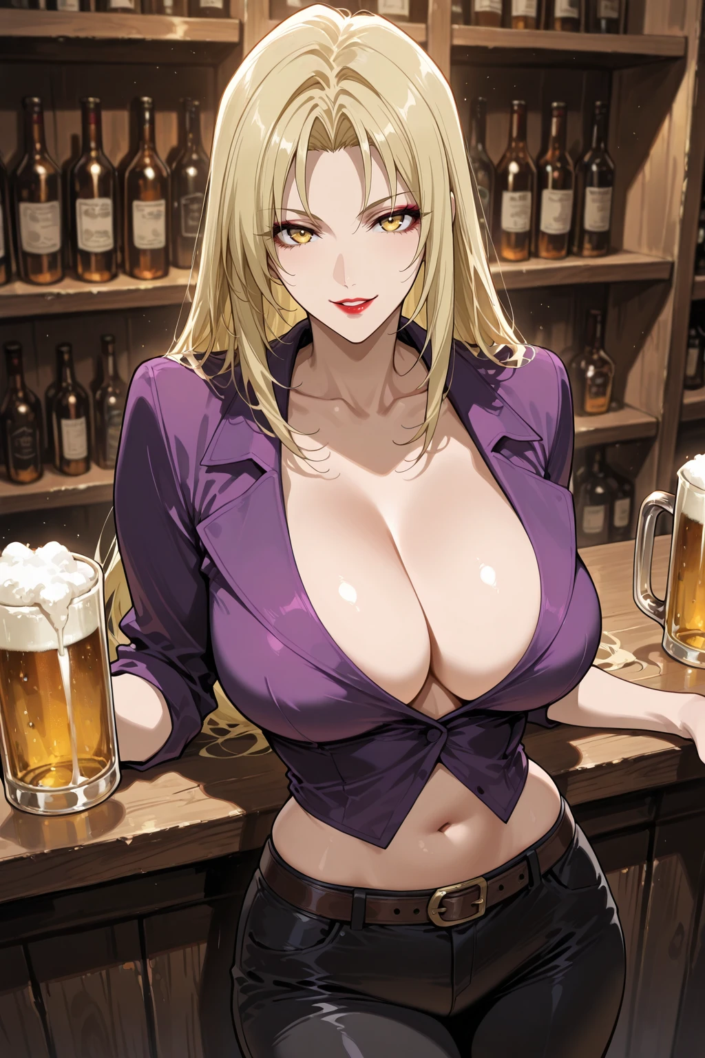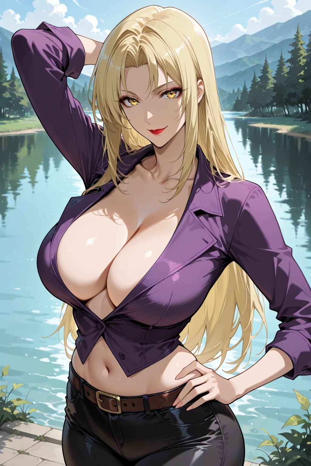 purple collared shirt, collarbone, cleavage, , long sleeves, navel, belt, black pants