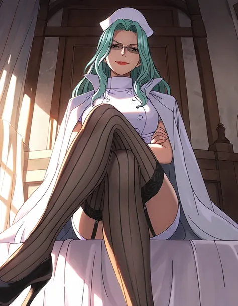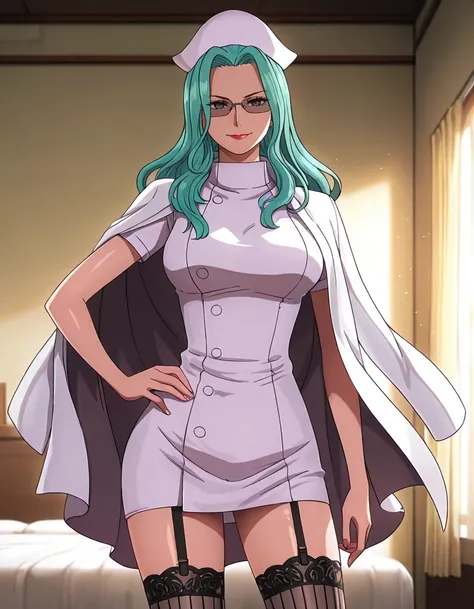 1.<lora:Alpha_SDXL_IL_V1:0.7>,A1l6ph6a,1girl,solo,nurse,green hair,long hair,aqua hair,nurse cap,sunglasses,grey eyes,lipstick,dress,white coat,jacket on shoulders,(vertical-striped thighhighs:1.1),black thighhighs,garter straps,high heels,