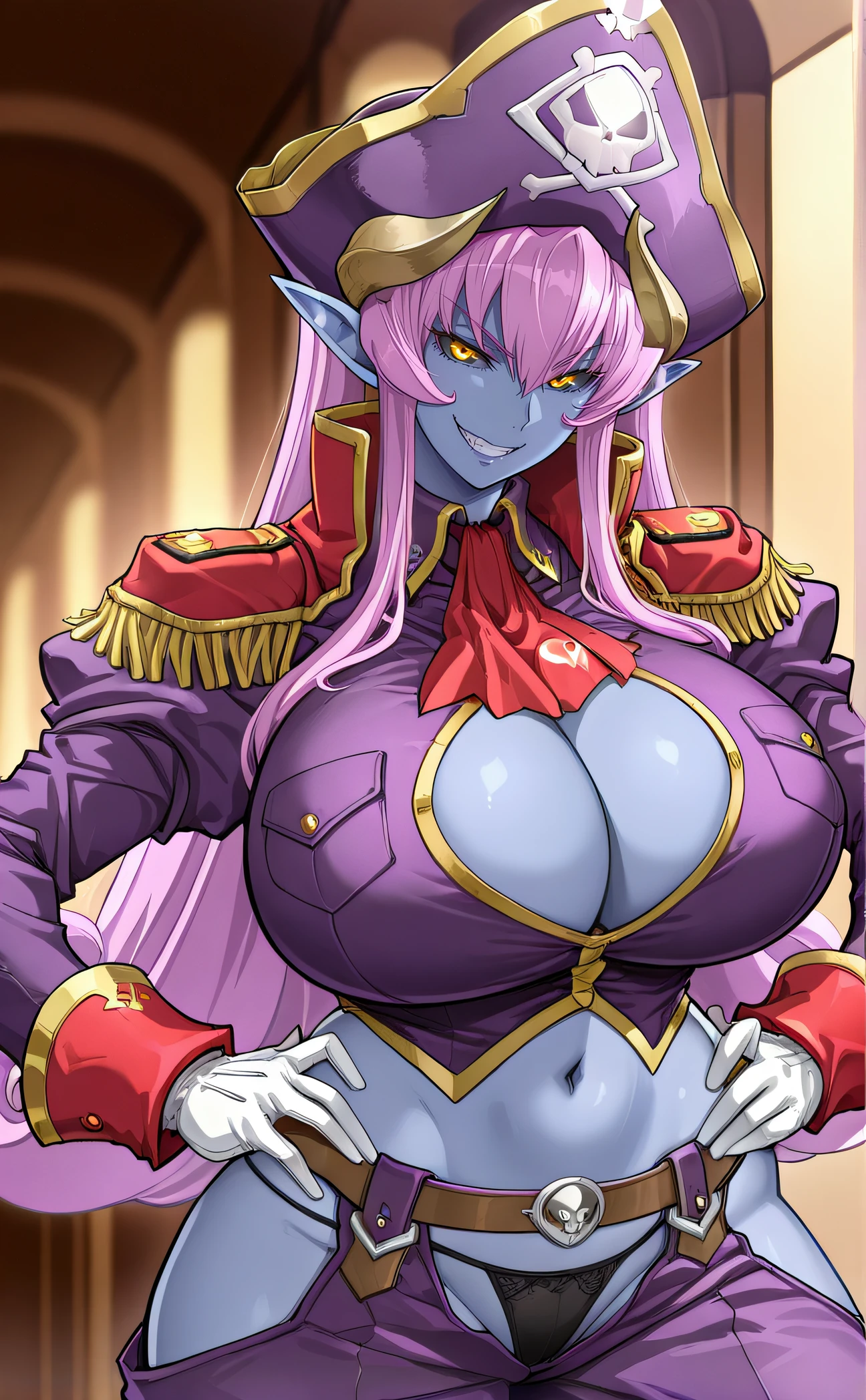 pirate hat, red ascot, white gloves, purple jacket, black panties, tummy, navel, purple hakama pants, clothing cutout, cutout pants