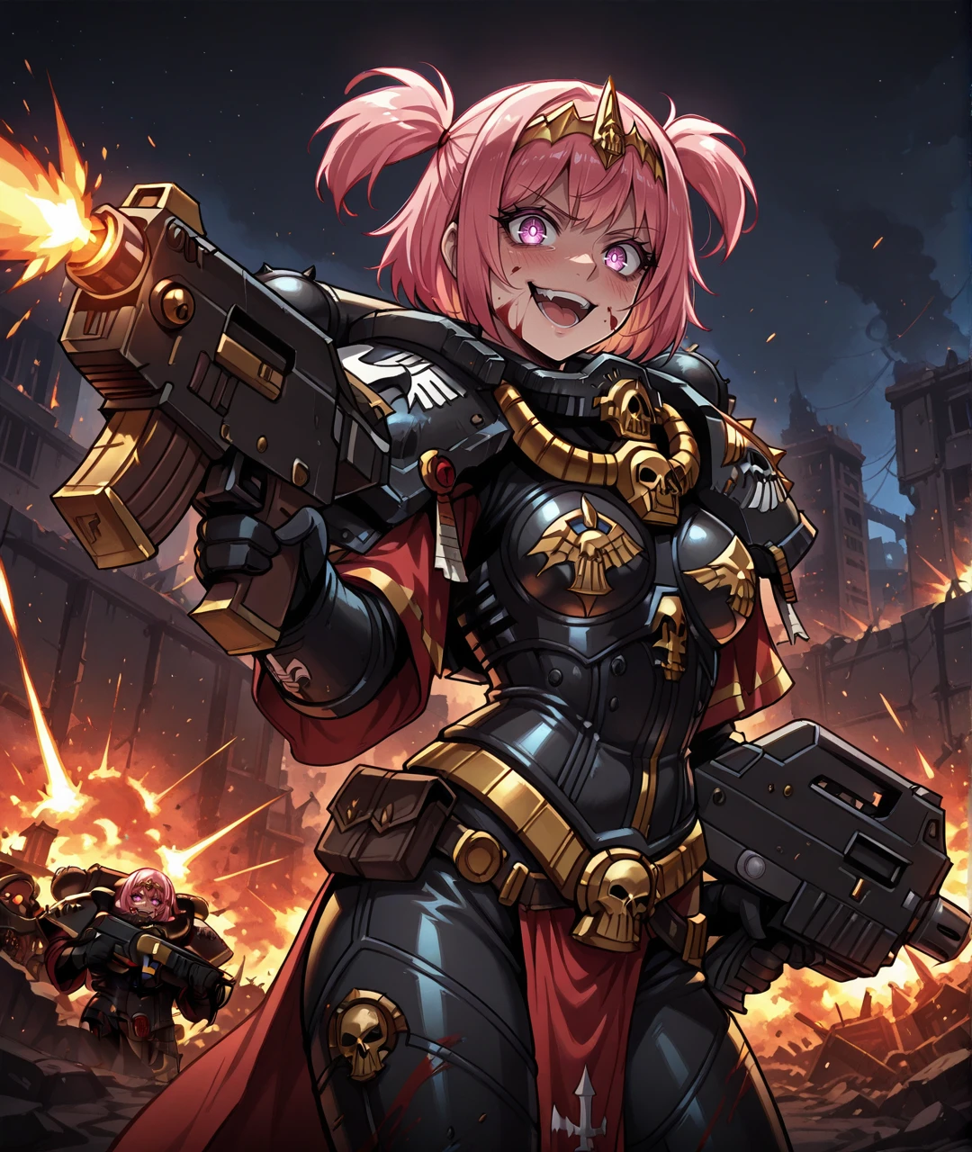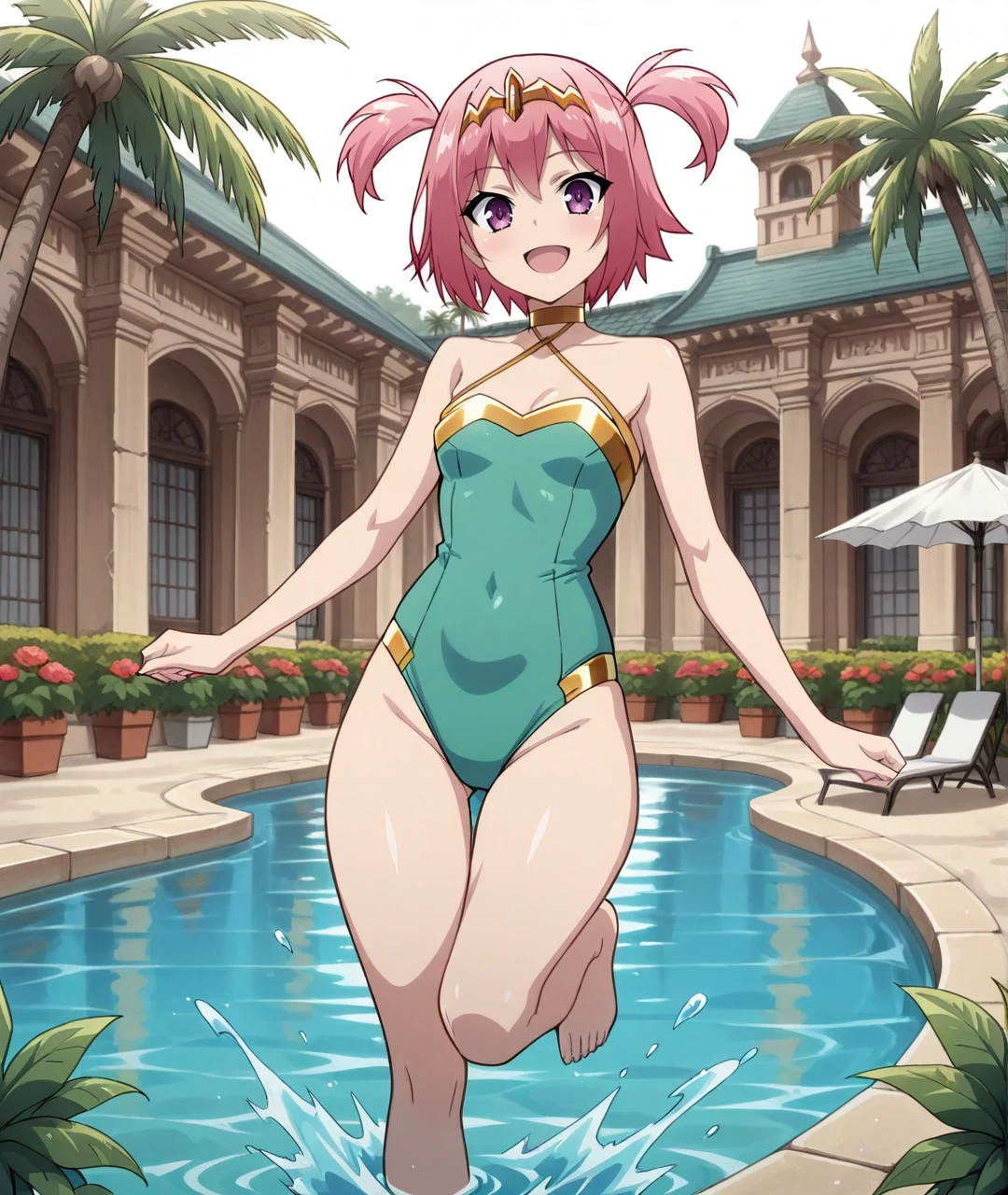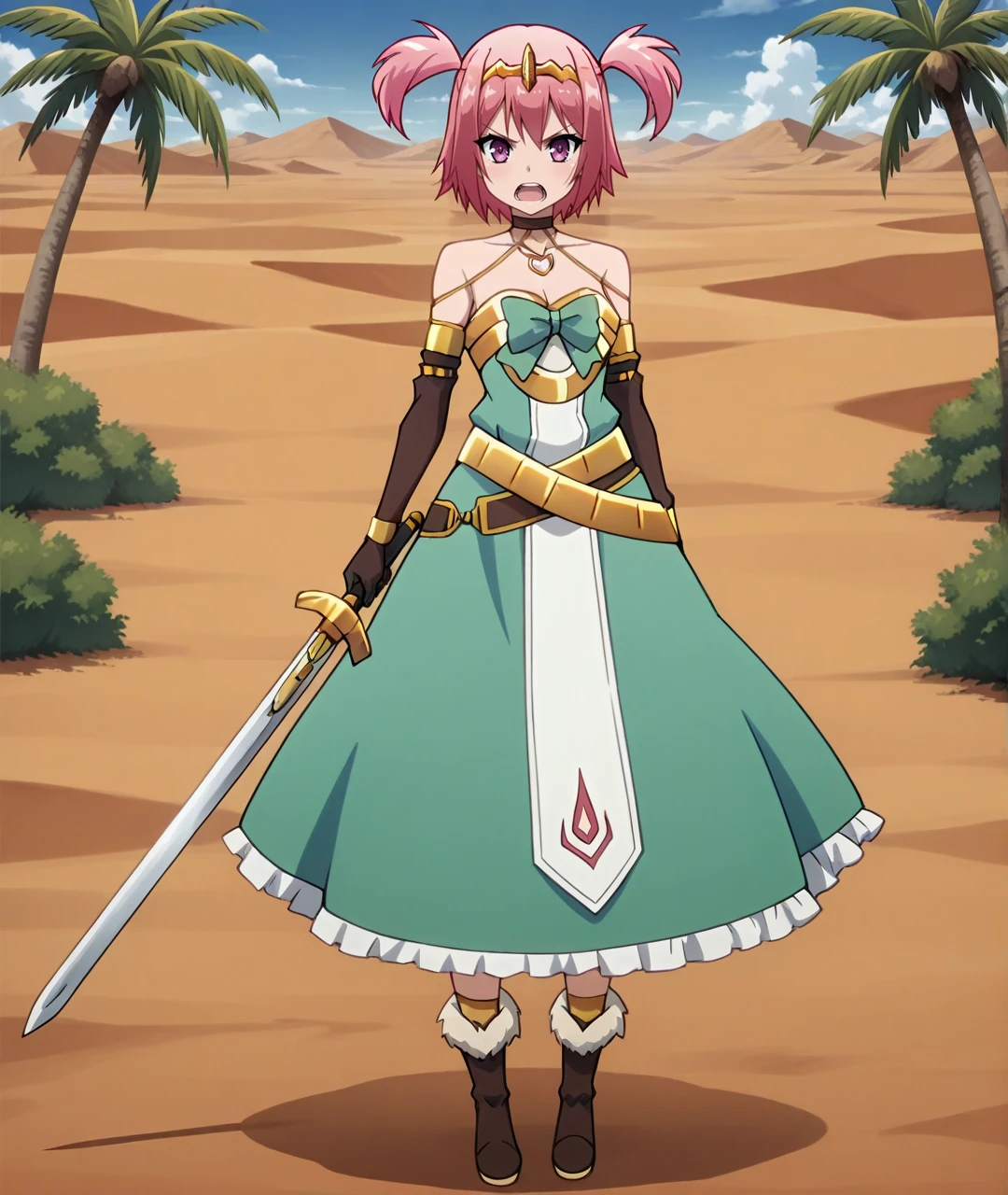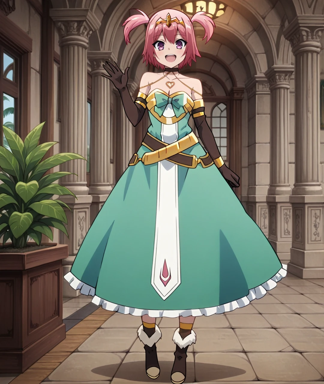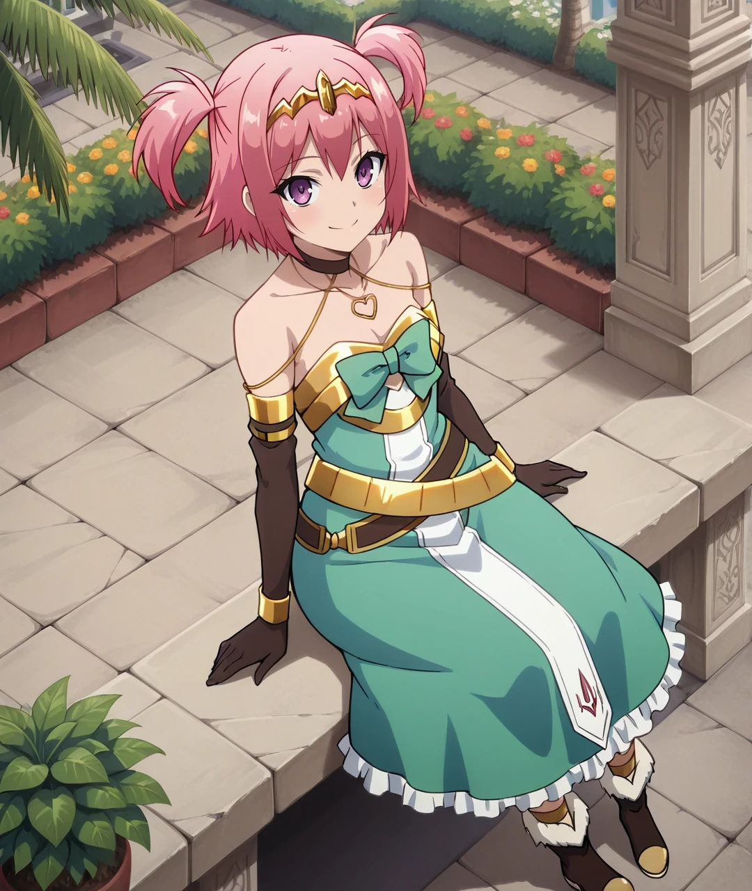 Tags: LinneaBase, purple eyes, pink hair, twin tails, short hair, golden tiara, brown choker, heart pendant, ???? shoulders, collarbone, small ???????, green dress, strapless dress, frilled hem, green bow, gold accents, brown elbow gloves, gold ankle cuff, multiple belts, gold belt, brown belt, fur boots, brown boots,
