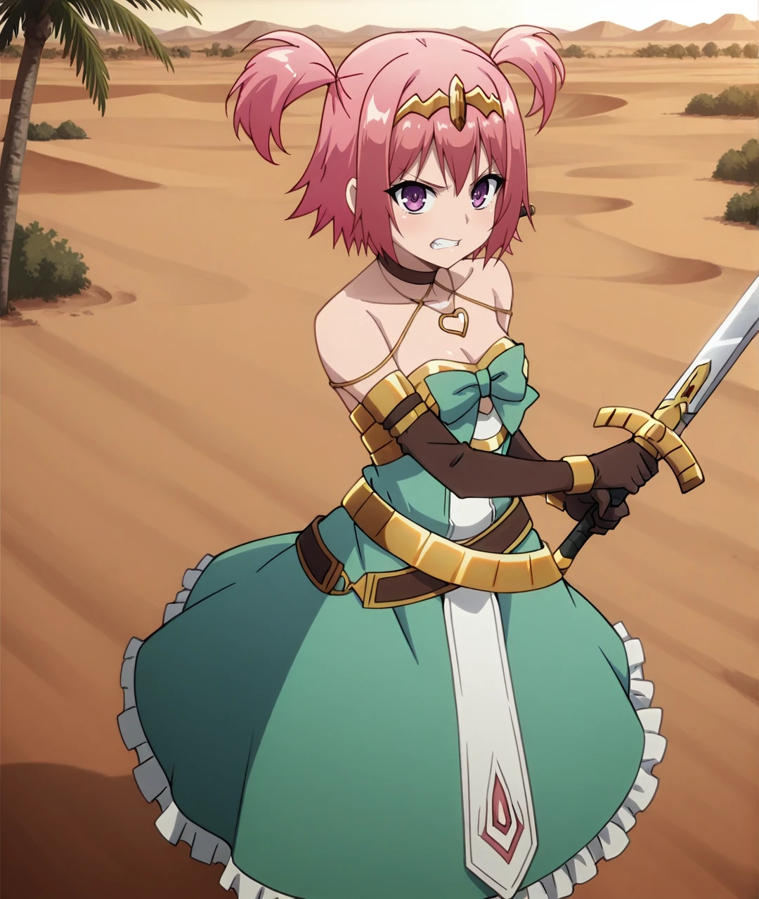 LinneaBase, purple eyes, pink hair, twin tails, short hair, golden tiara, brown choker, heart pendant, bare shoulders, collarbone, small breasts, green dress, strapless dress, frilled hem, green bow, gold accents, brown elbow gloves, gold ankle cuff, multiple belts, gold belt, brown belt, fur boots, brown boots,