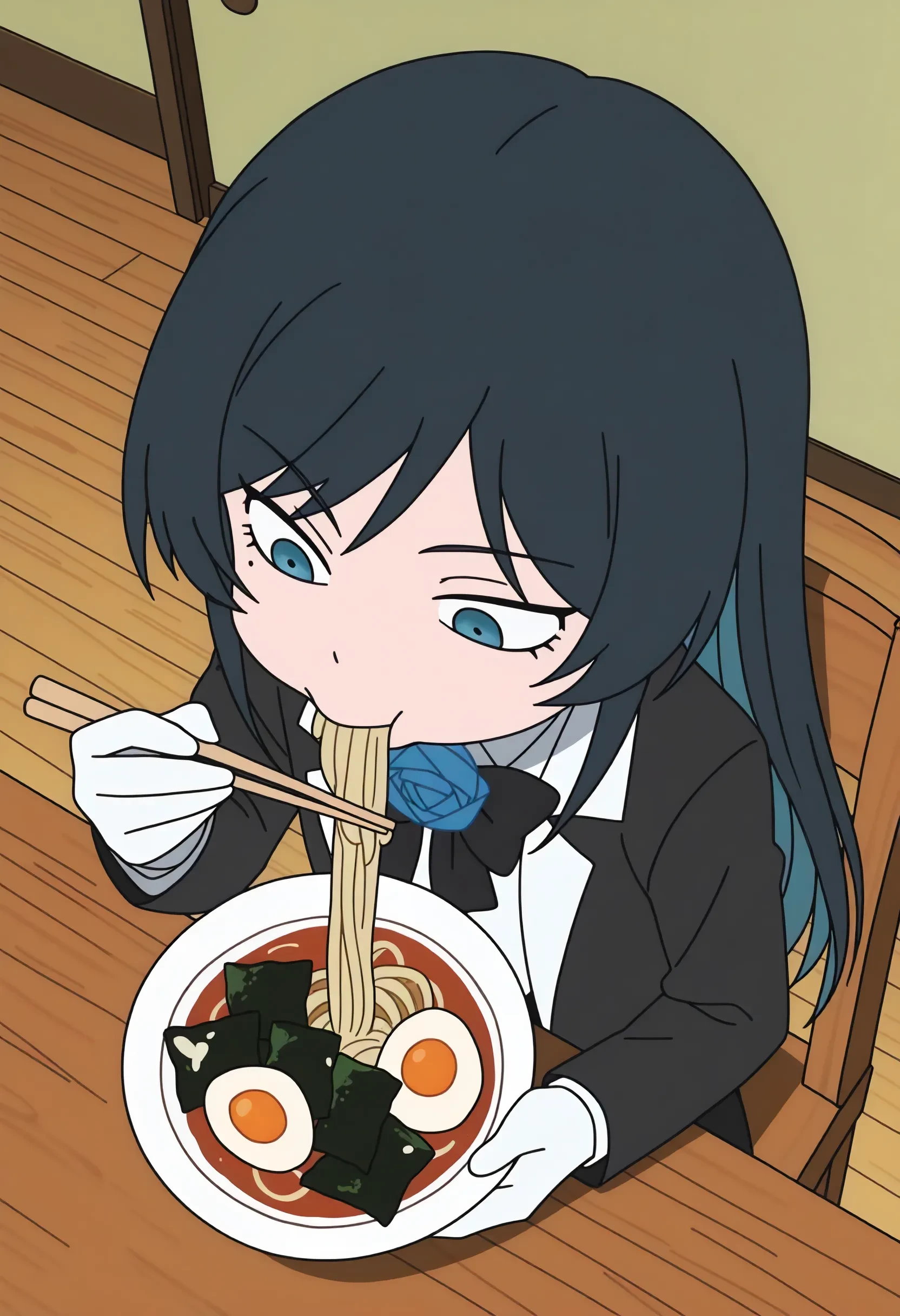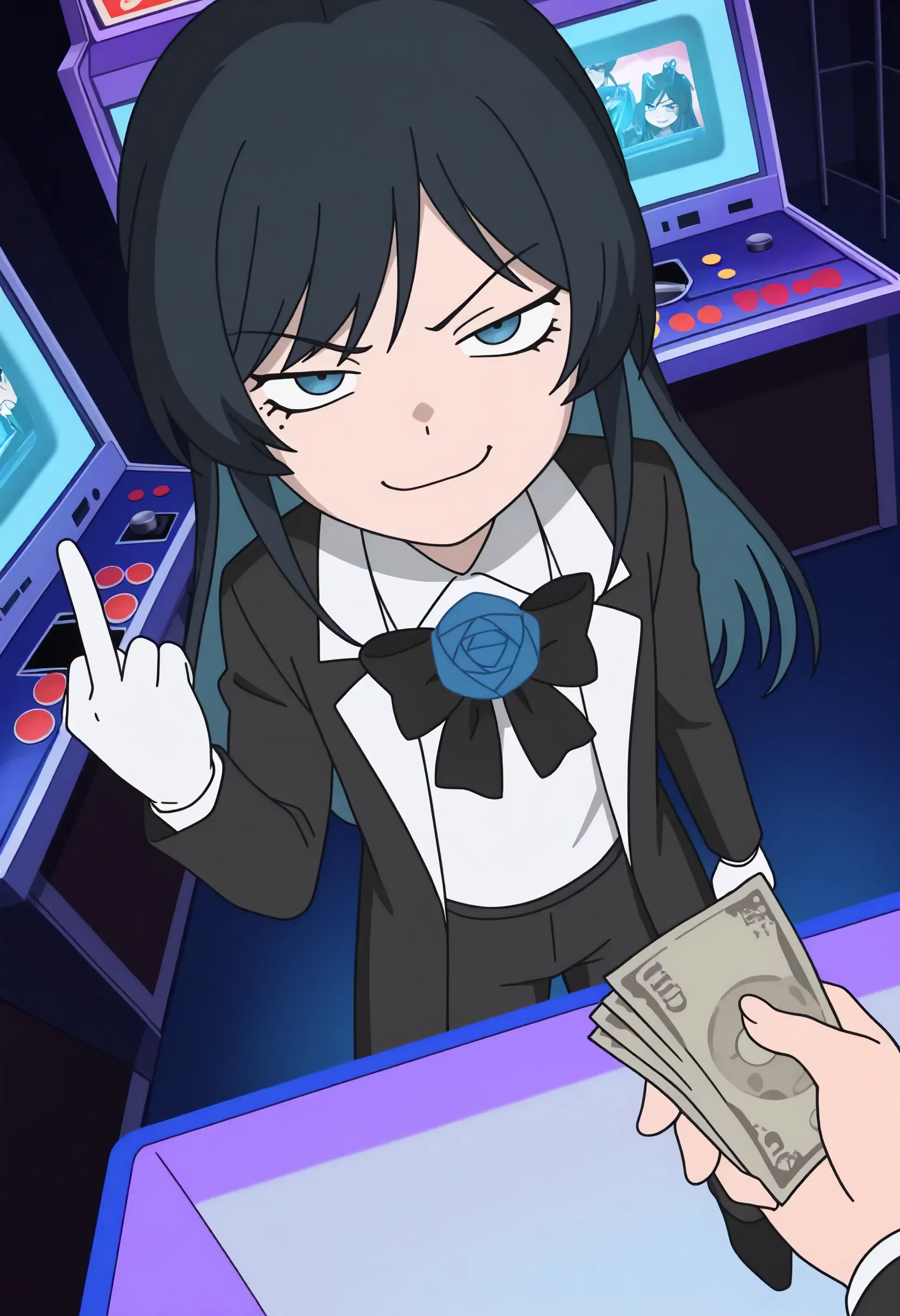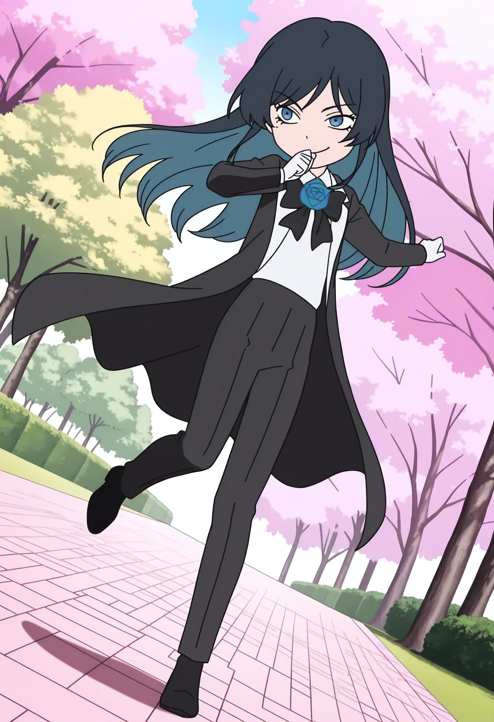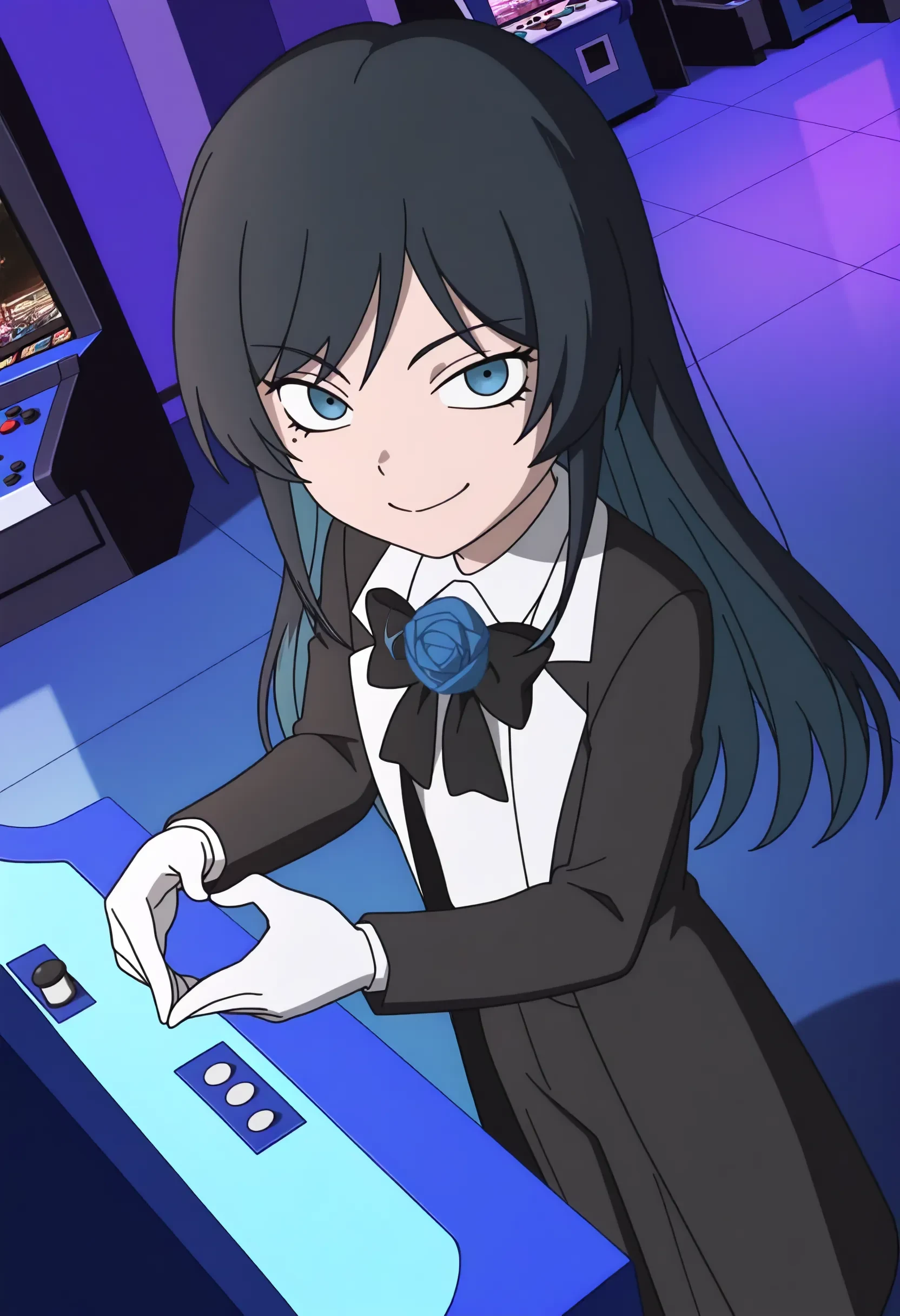 chando \(ado\), black hair, blue inner hair, long hair, blue eyes, mole under eye, black bowtie, blue rose brooch, collared white shirt, black coat, white gloves, black pants, black shoes,