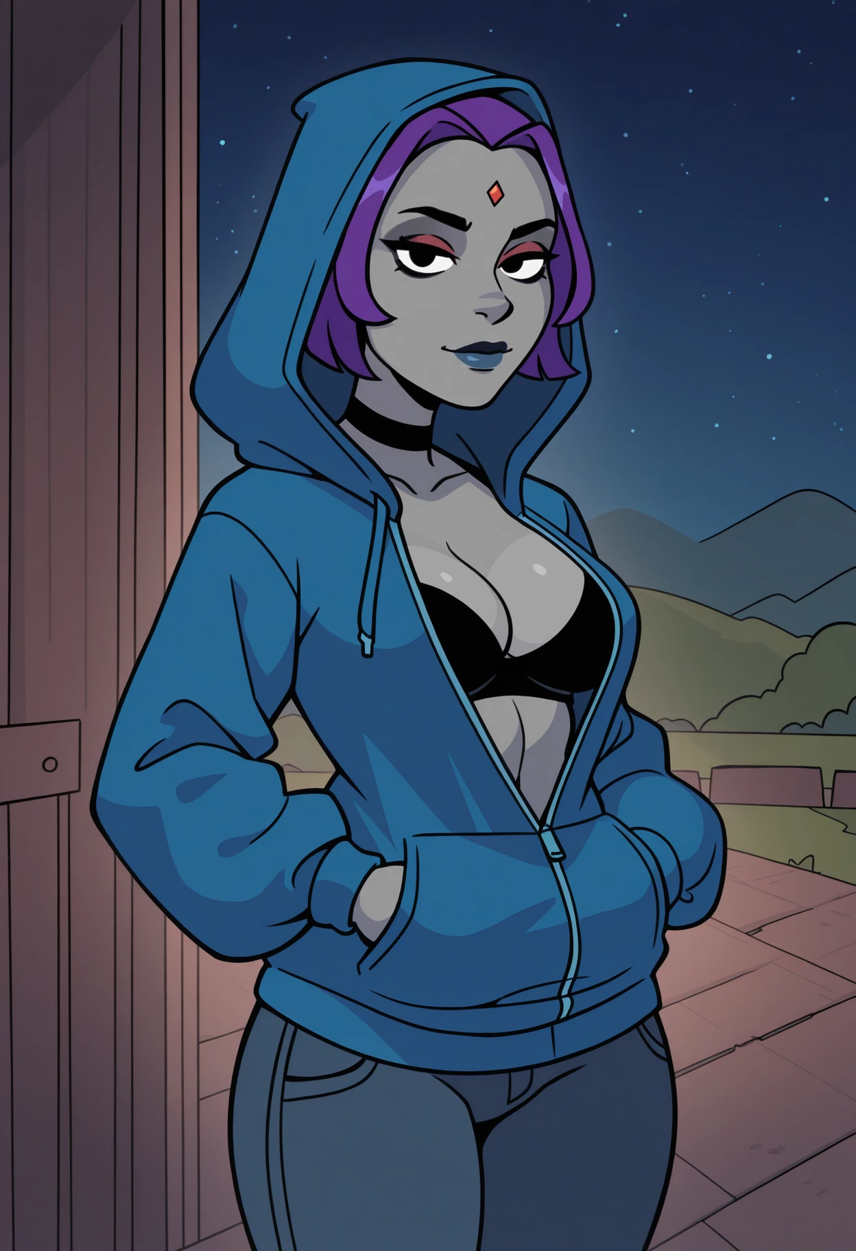 alternate costume, choker, black choker, hood, hoodie, blue hoodie, hood up, cleavage, underwear, bra, black bra, pants,