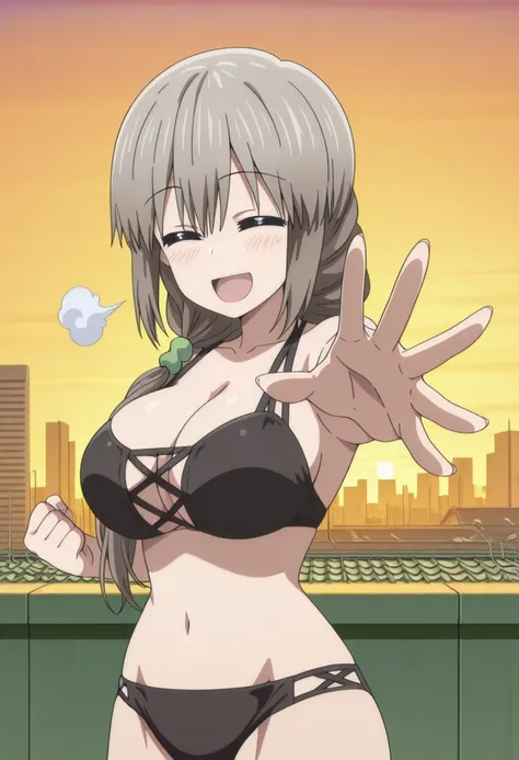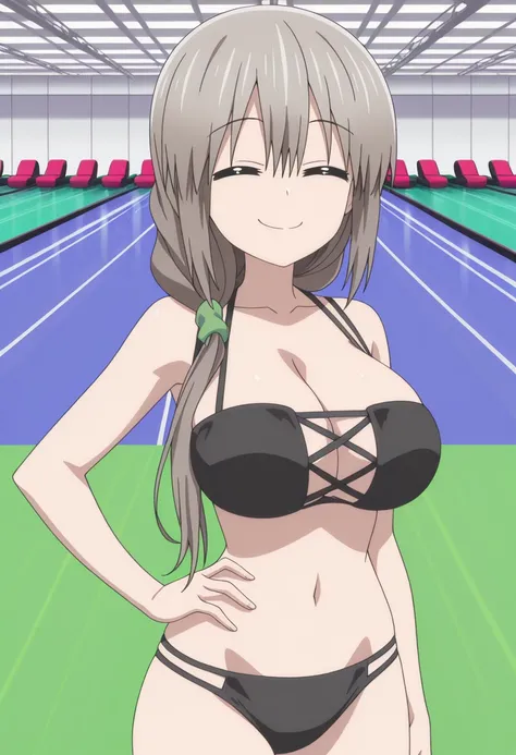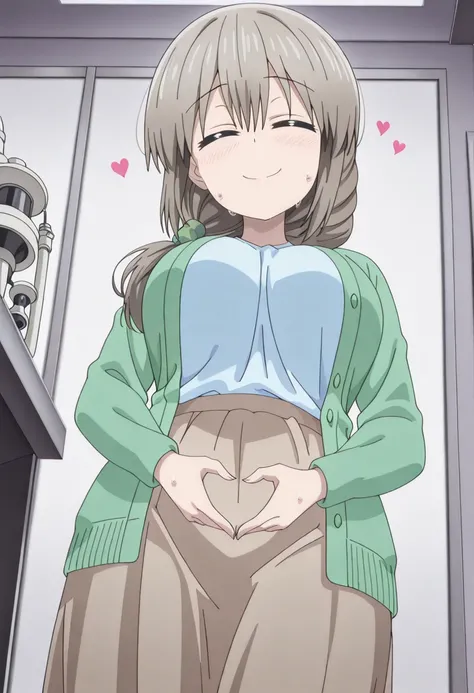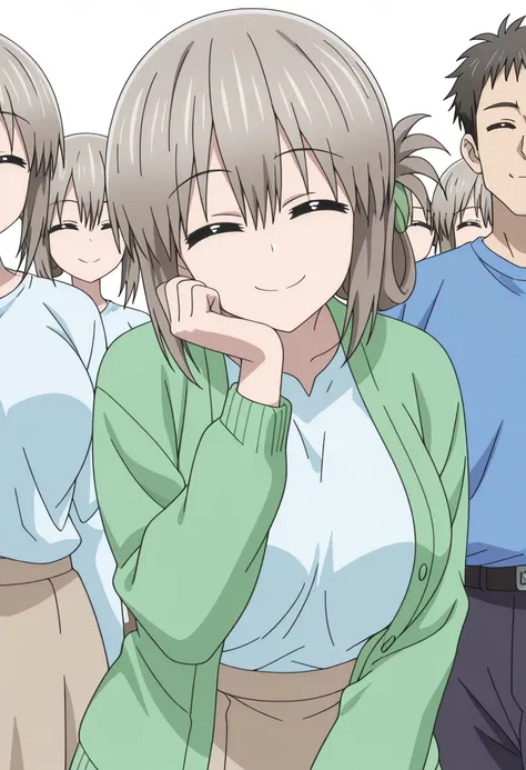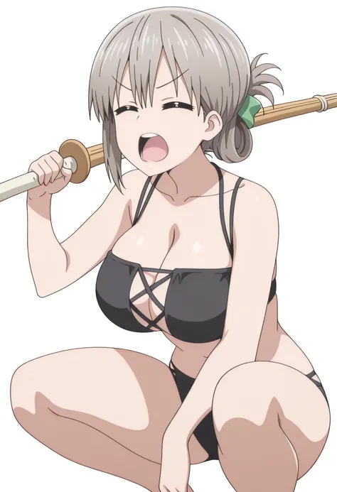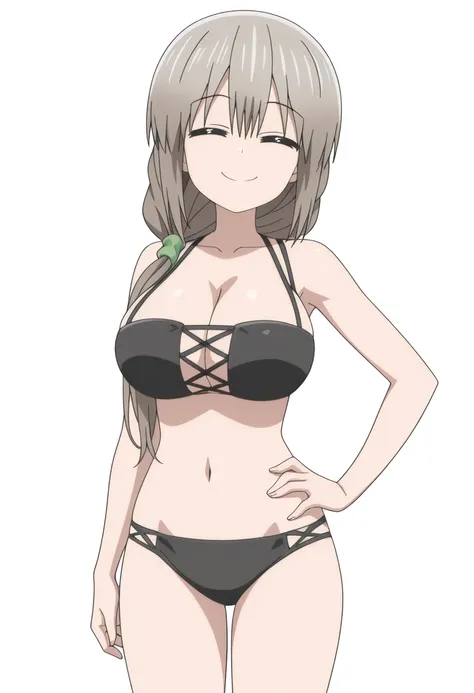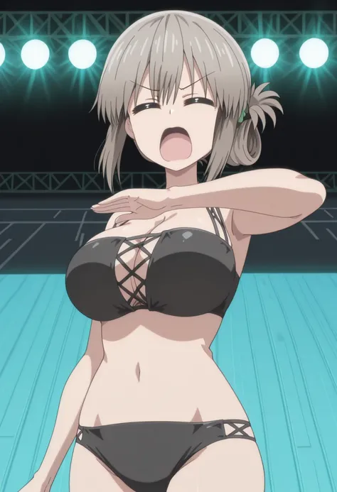 tsuki uzaki, closed eyes, grey hair, folded ponytail, mature female, large breasts, anime screencap