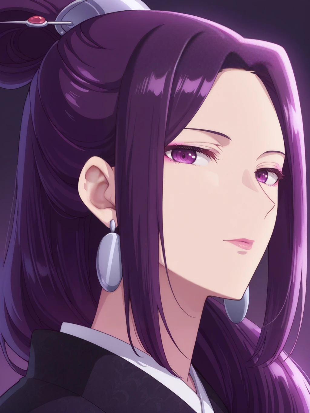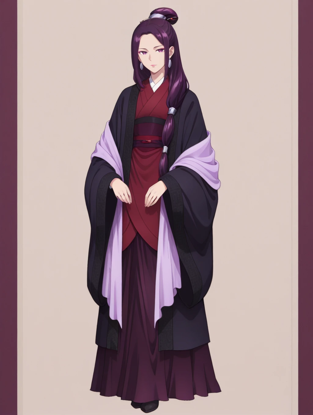 ywad,purple hair,hair ornament,hair stick,hair bun,long hair,purple eyes,pink eyeshadow,parted bangs,hair over shoulder,low-tied long hair,pink lips,earrings,red hanfu,pink shawl,purple sash,black robe,purple skirt,