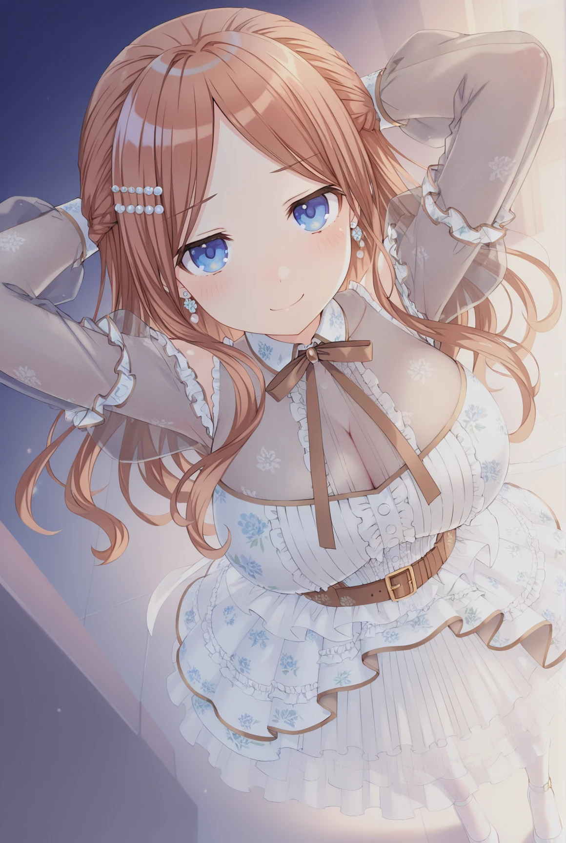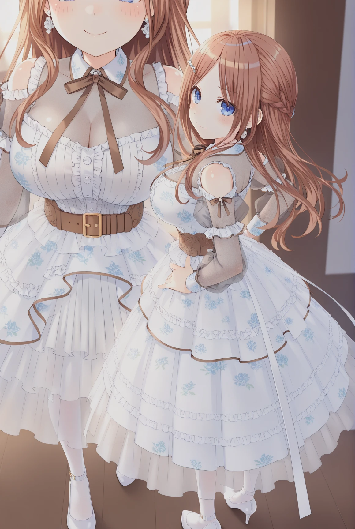 soyo,1girl,solo,white dress,brown hair,see-through sleeves,see-through,jewelry,long hair,brown belt,long sleeves,frills,earrings,high-low skirt,blue eyes,frilled dress,white footwear,parted bangs,ankle strap,layered dress,white pantyhose,neck ribbon,braid,hair ornament,off-shoulder dress,clothing cutout,belt buckle,shoes,puffy long sleeves,bow,buckle,center frills,sidelocks,brown ribbon,pumps,see-through dress,puffy sleeves,traight hair,high heels,pearl hair ornament,pearl earrings,print dress,flower earrings,floral print,hairclip, huge breasts,cleavage,