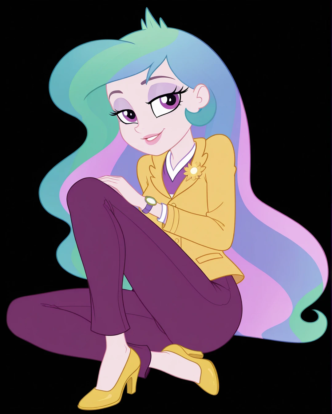 principal_celestia, multicolored hair, purple eyes, purple pants, yellow jacket, yellow footwear, watch, wristwatch, long sleeves, suit,