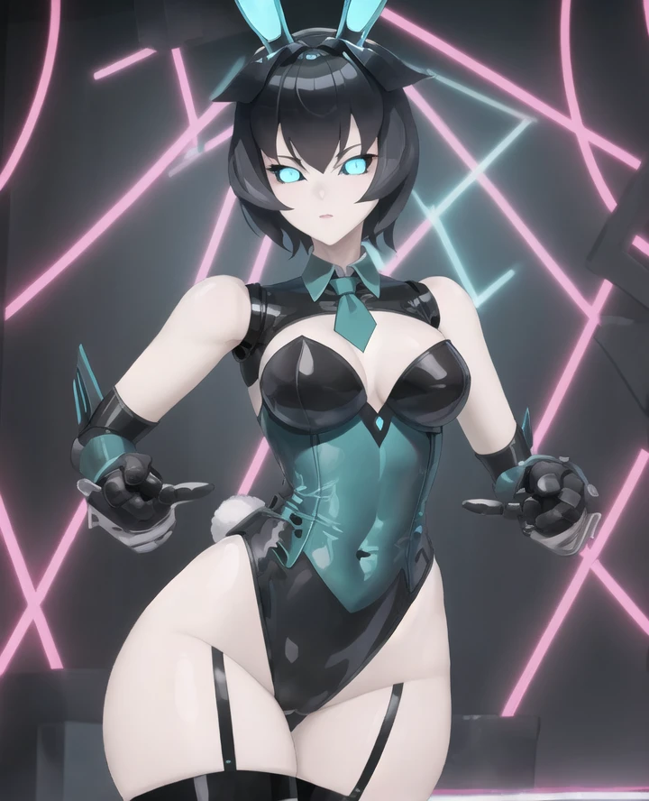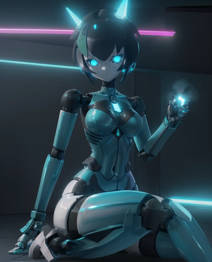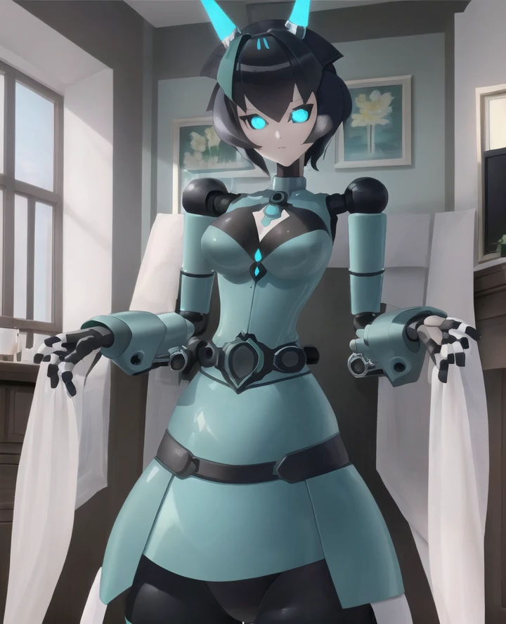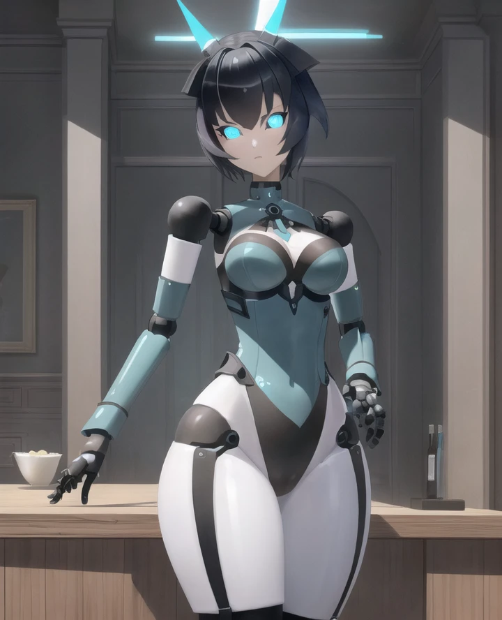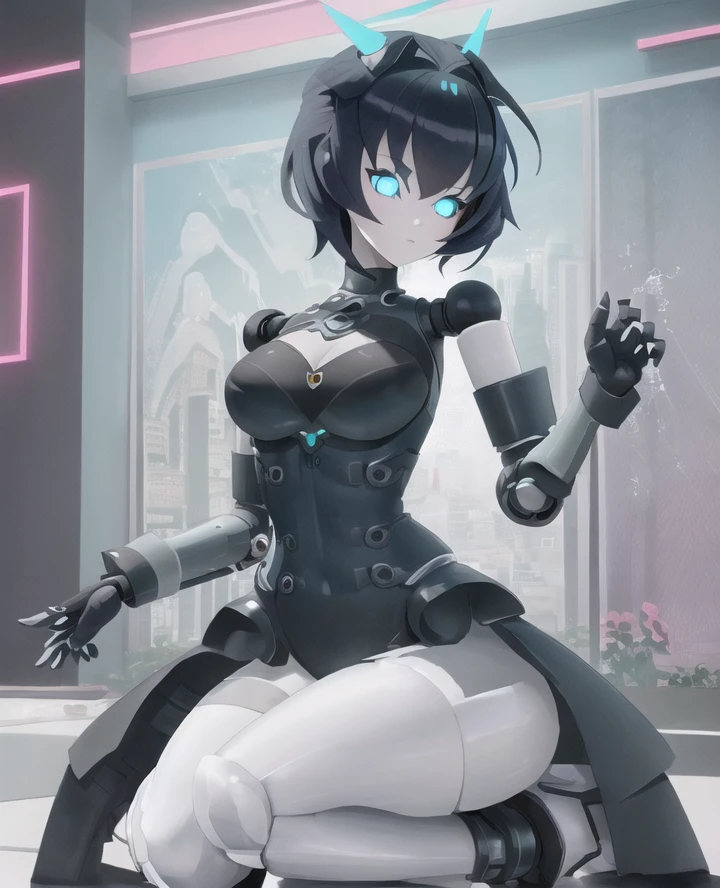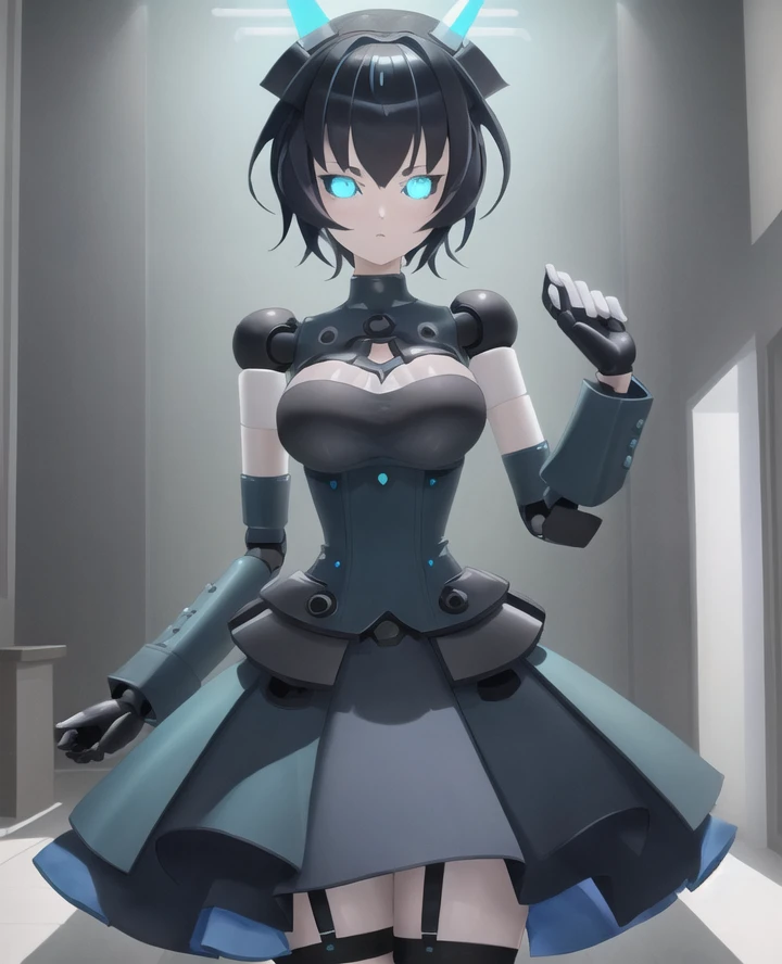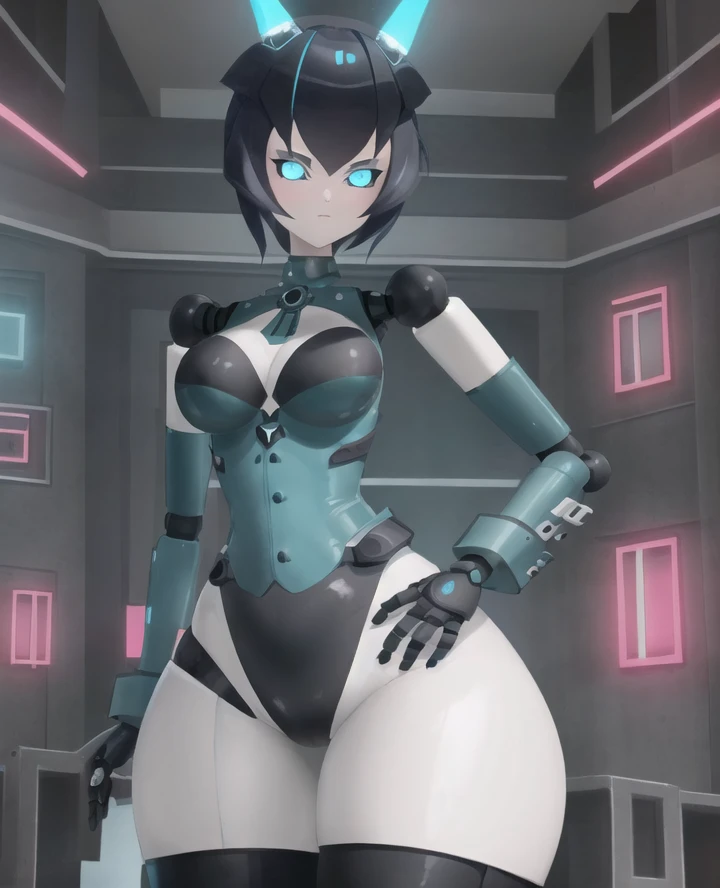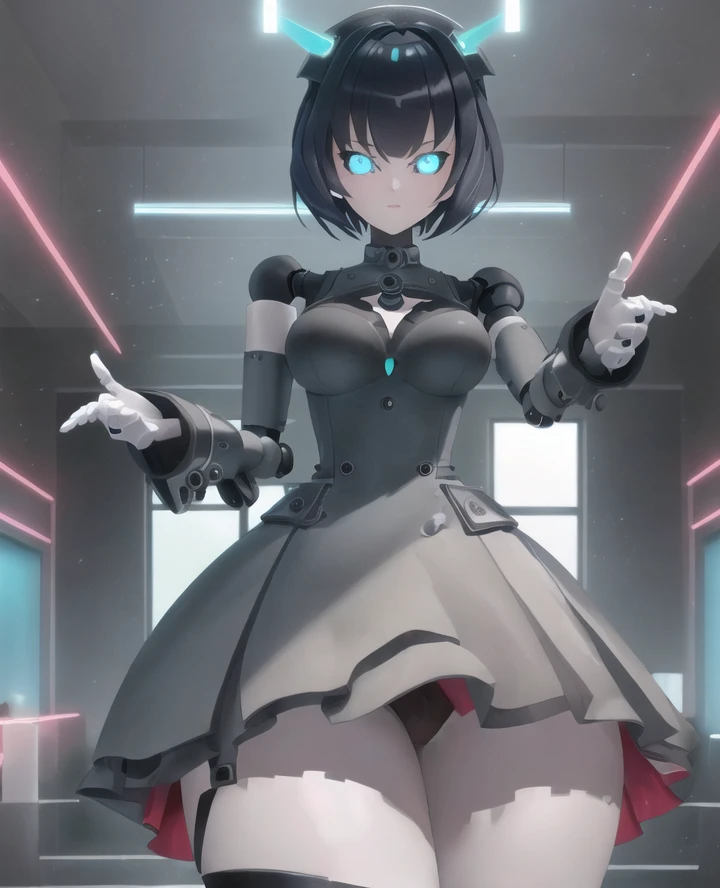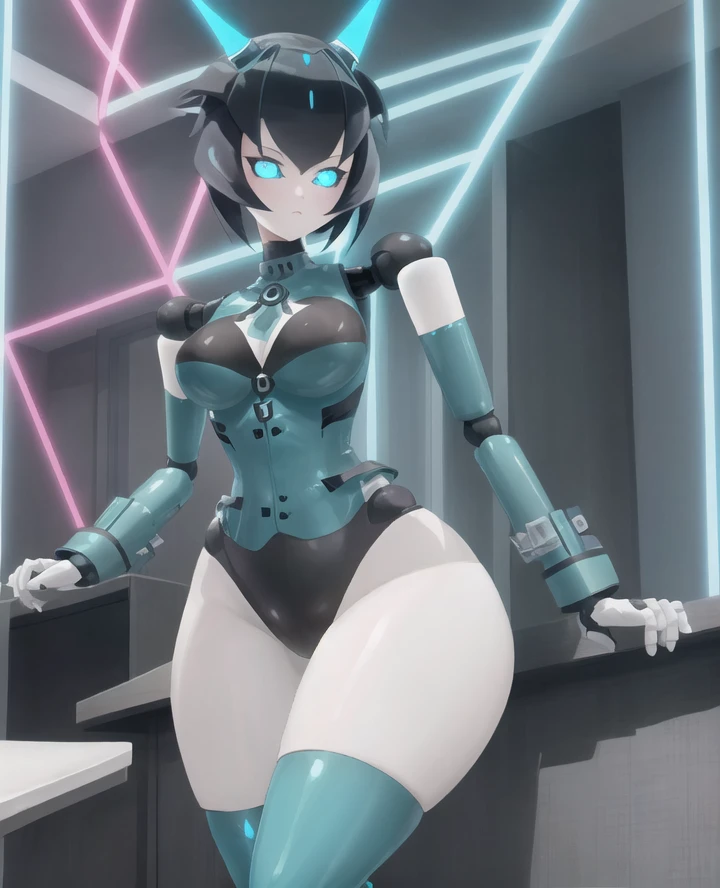 1girl, yogurt cap, robot joints, android, glowing eyes, blue eyes, wide hips, Short hair, black hair, robot hands,