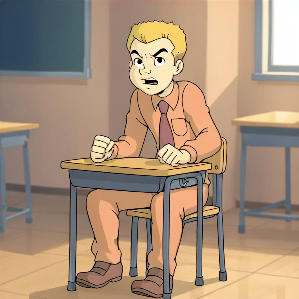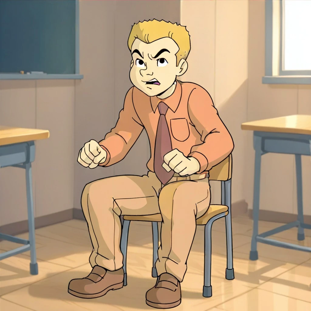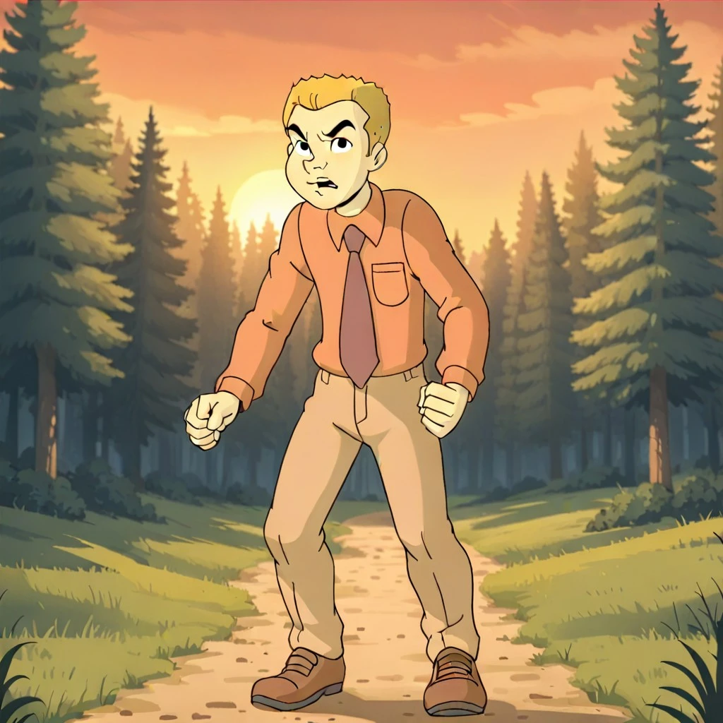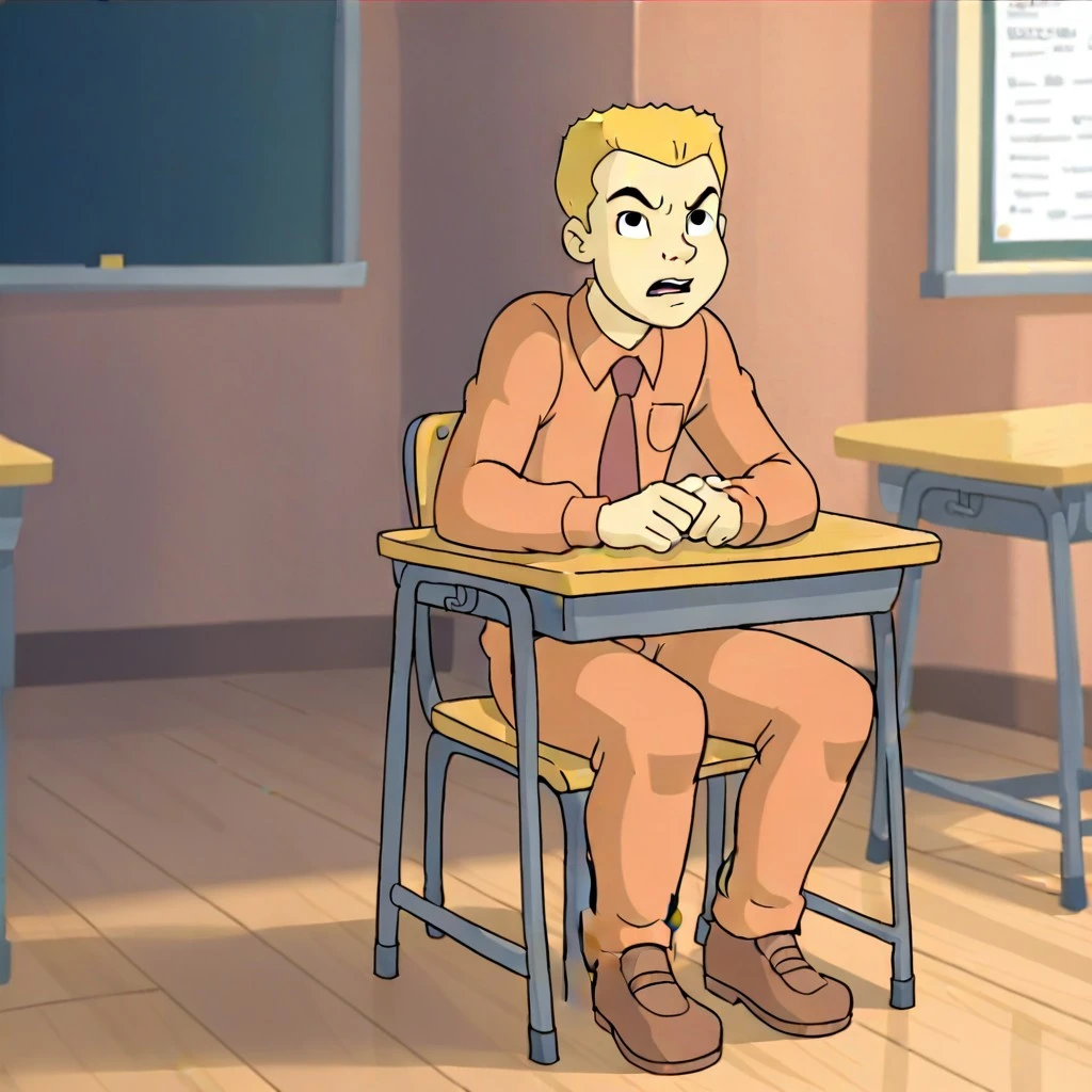 1Boy, Solo, Blonde Hair, Short Hair, Buzz-cut, Black Eyes, Black Eyebrows Long Sleeves Orange (Color) Dress Shirt, Shirt Tucked In, Grayish-Red Tie, Tan (Color) Dress Pants, Brown Dress Shoes
