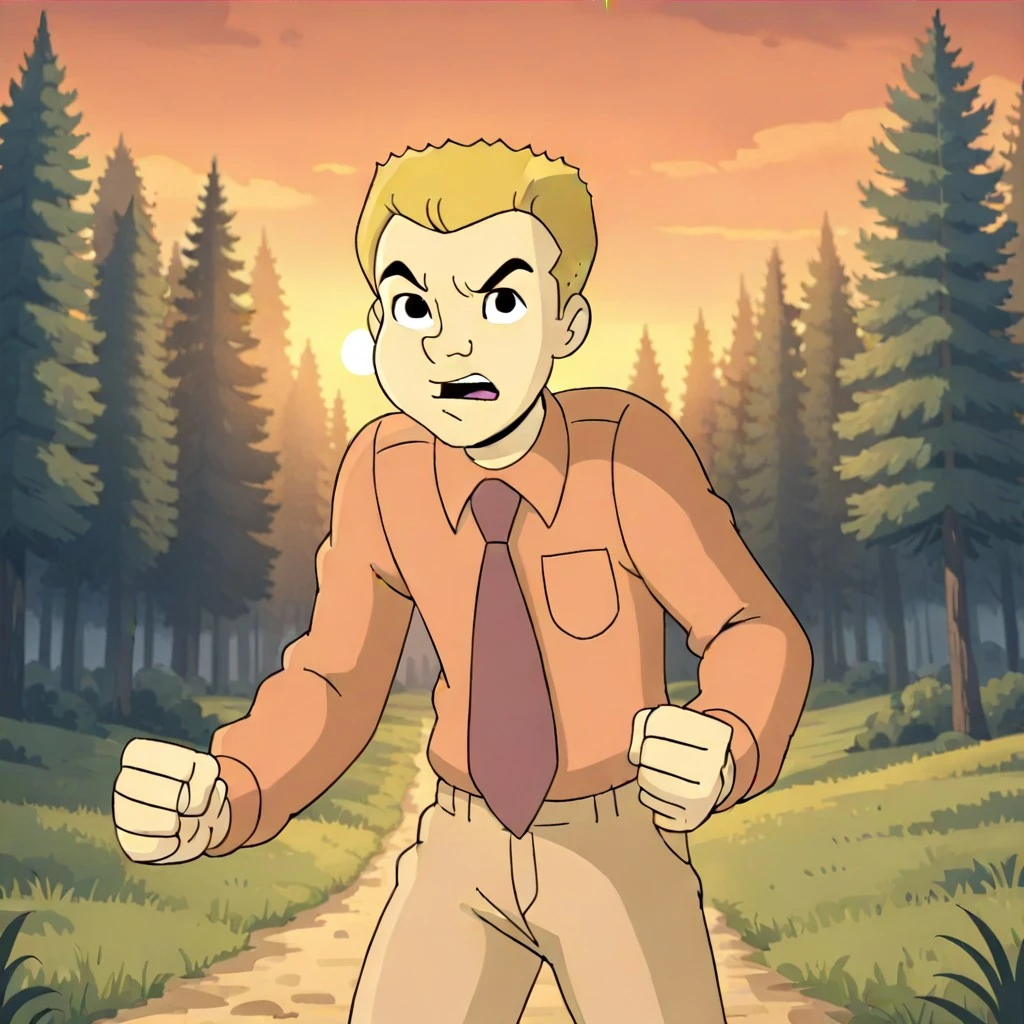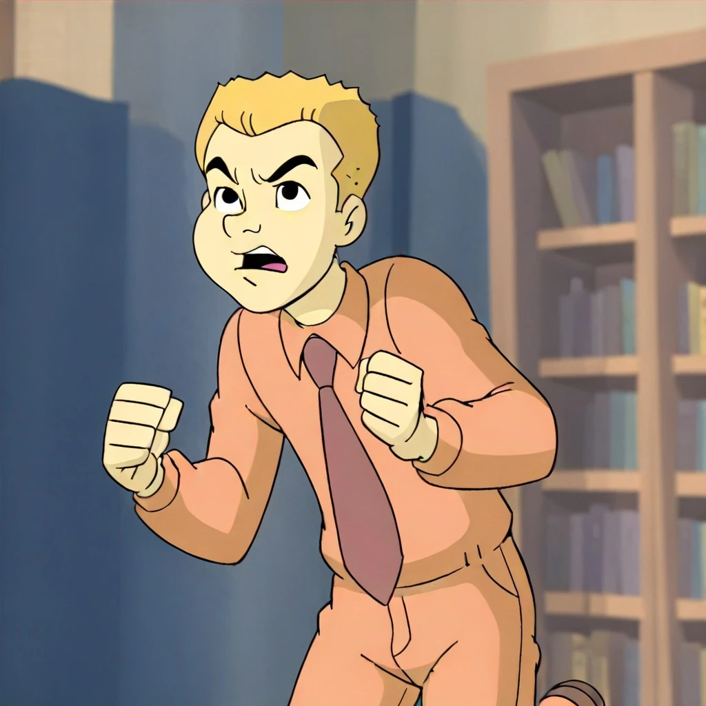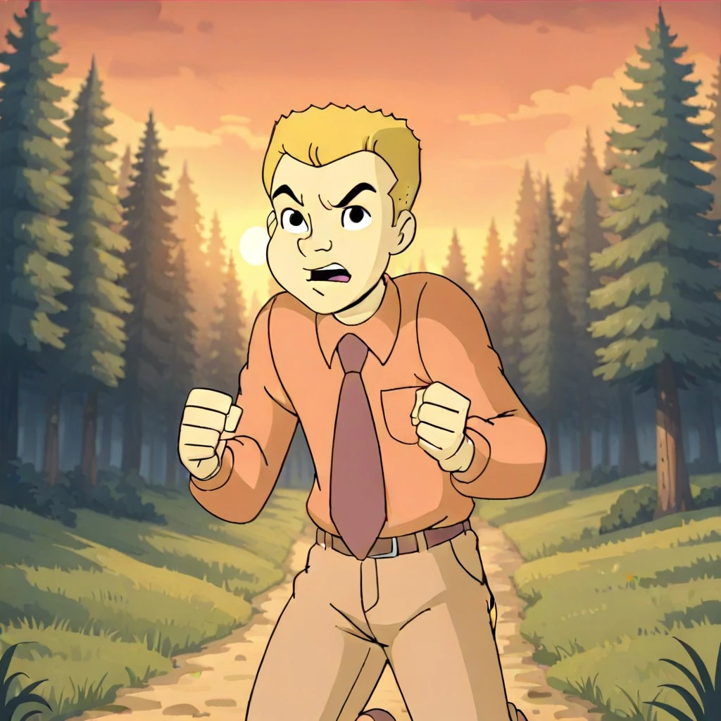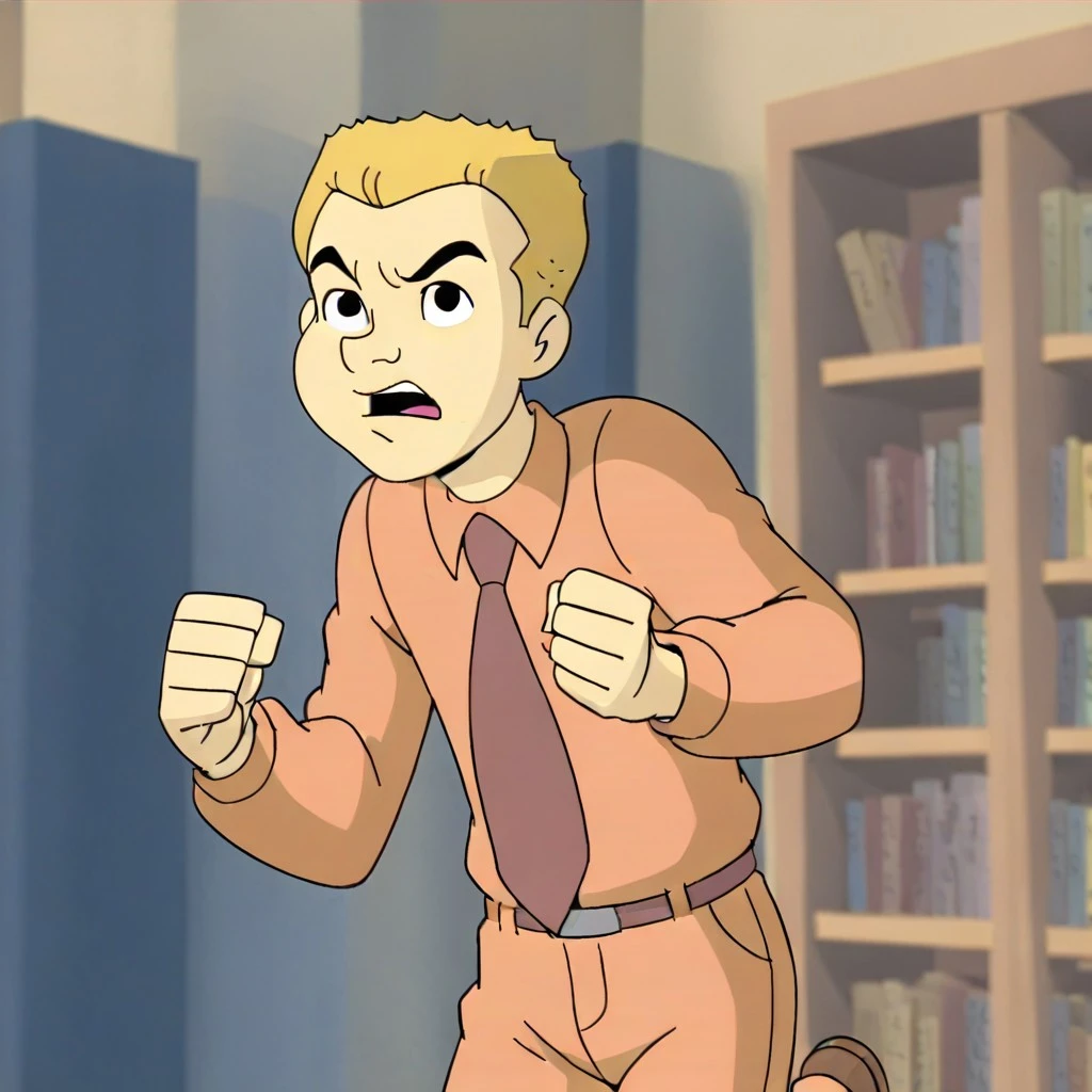 (Version 1.0): Elliot_blender_wnsd, Blonde Hair, Short Hair, Buzz-cut, Black Eyes, Black Eyebrows Long Sleeves Orange (Color) Dress Shirt, Shirt Tucked In, Grayish-Red Tie, Tan (Color) Dress Pants, Brown Dress Shoes