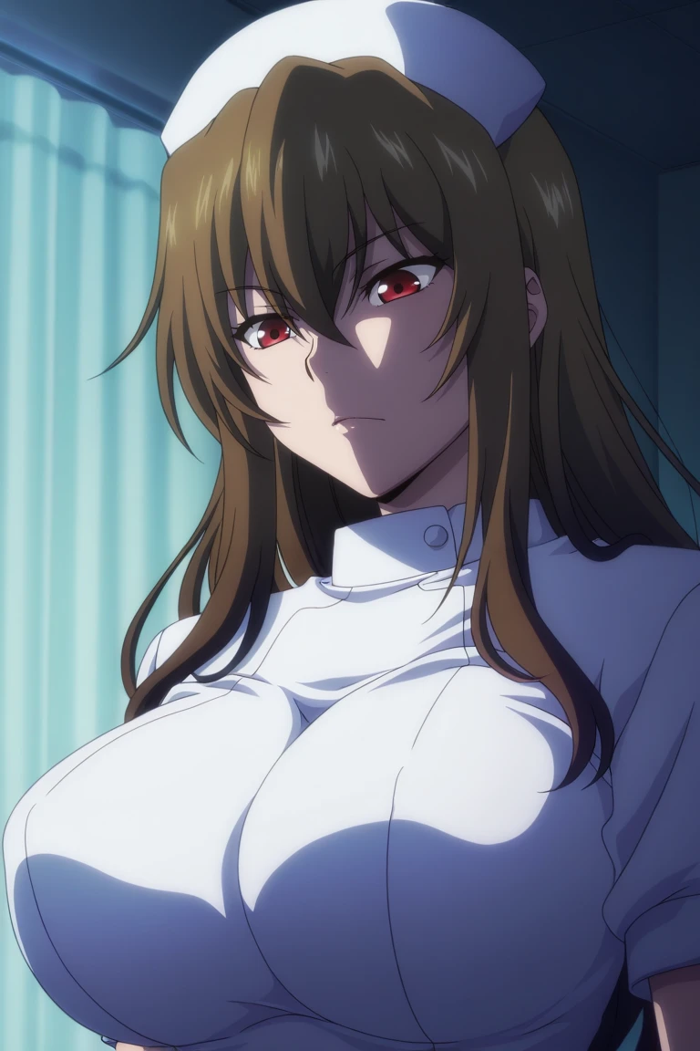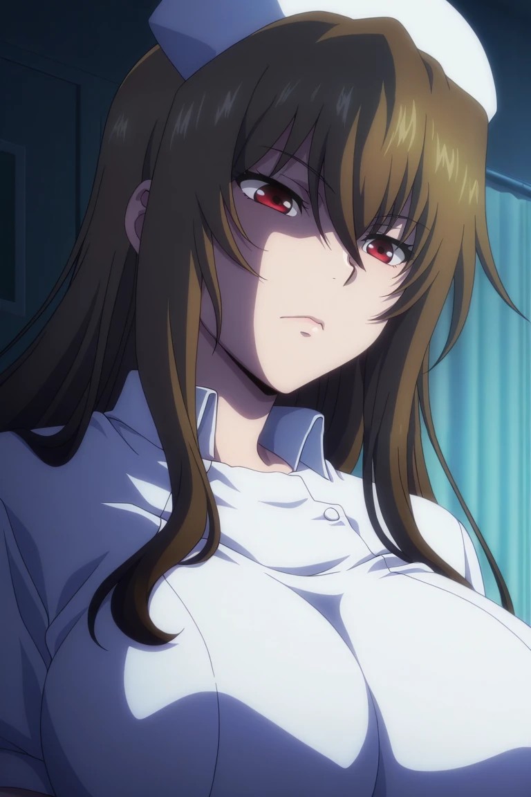 1girl, solo, Yamaguchi, long hair, brown hair, red eyes, glossy lips, big breasts, sexy, curvy, wide hips, thick thighs, official_style, anime_coloring