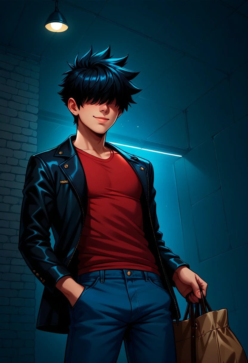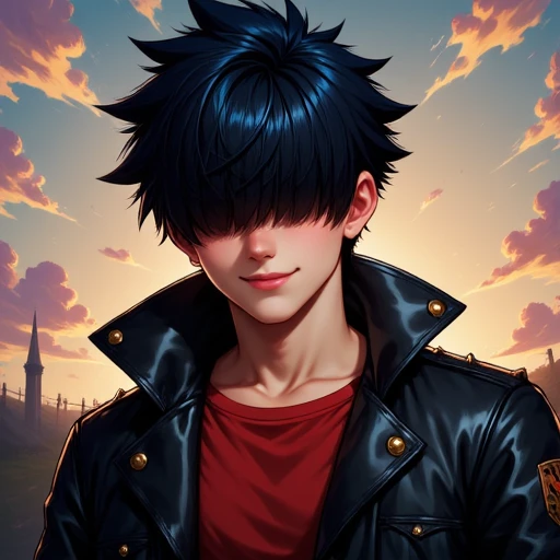 Boy wearing a red shirt and black jacket