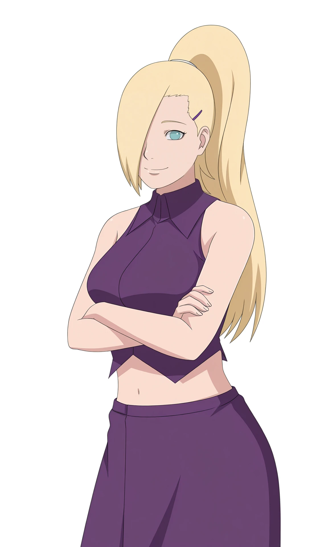 inoyamanakaboruto, hair over one eye, blue eyes, high ponytail, purple hairclip, blonde hair, collar, midriff, purple skirt, long skirt, sandals,