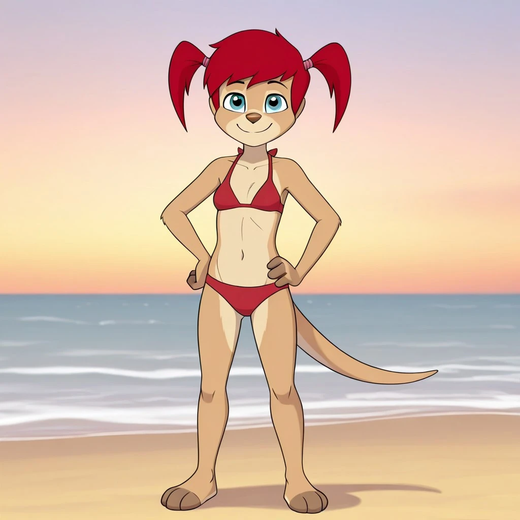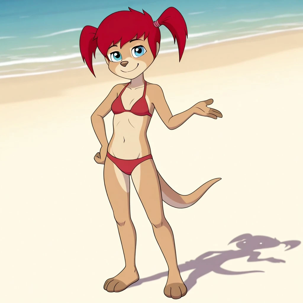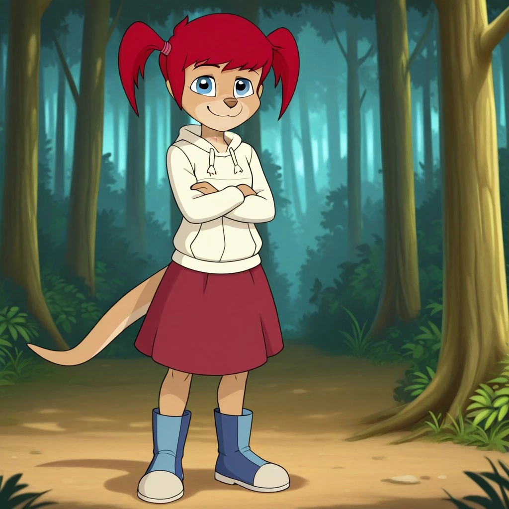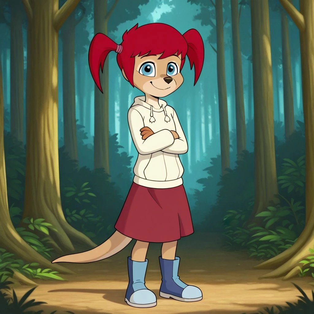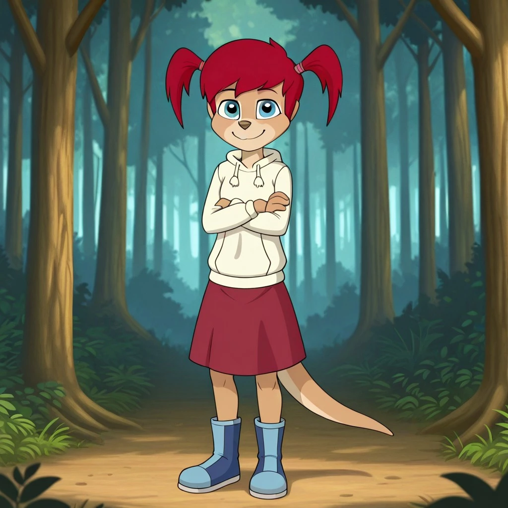 wallaby, tan fur, red hair, pigtails, blue eyes, brown nose, thick tail, cream hoodie, maroon skirt, blue and White boot,