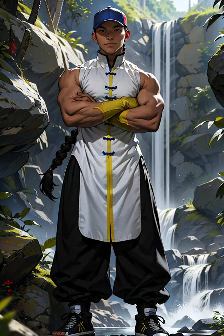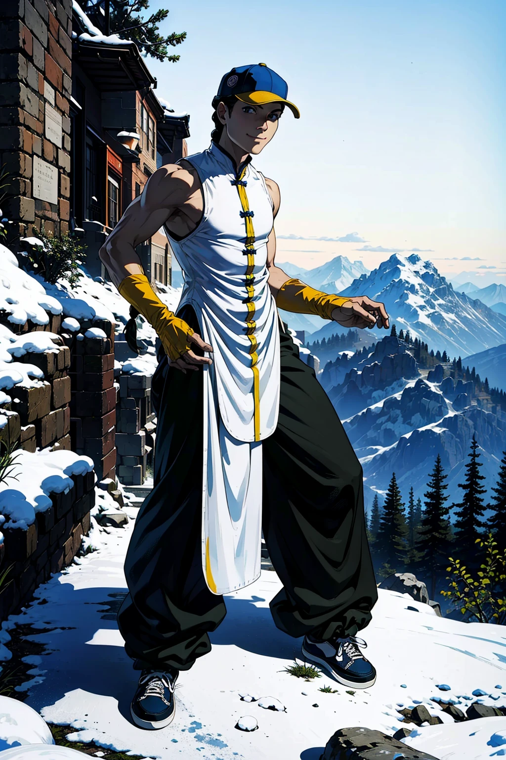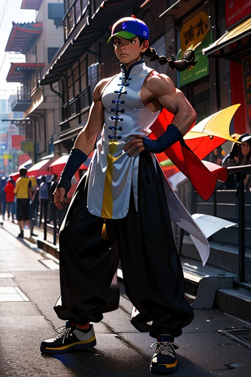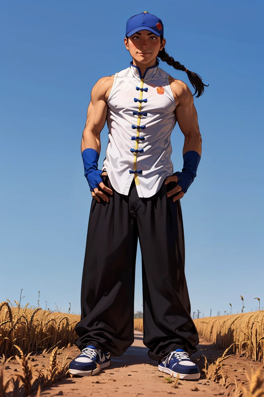 also: trucker cap, single braid, turtle neck, sleeveless shirt, chinese clothes, sleeveless changshan, fingerless gloves, baggy pants, black pants