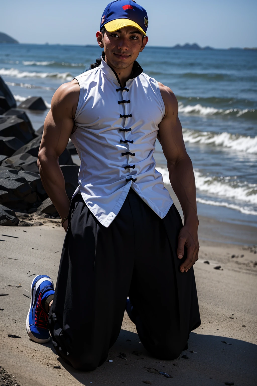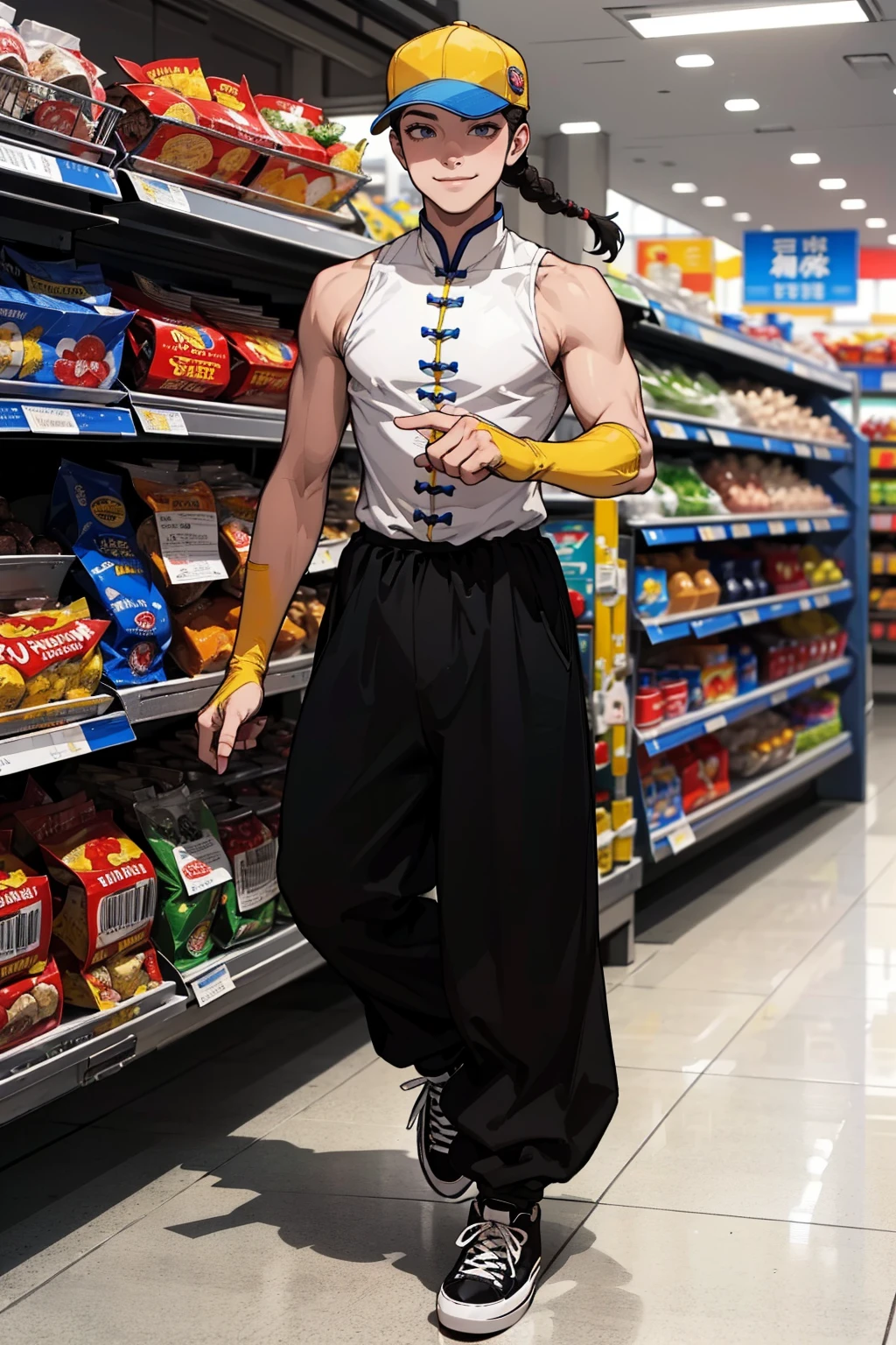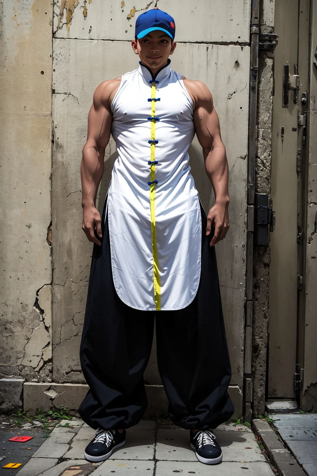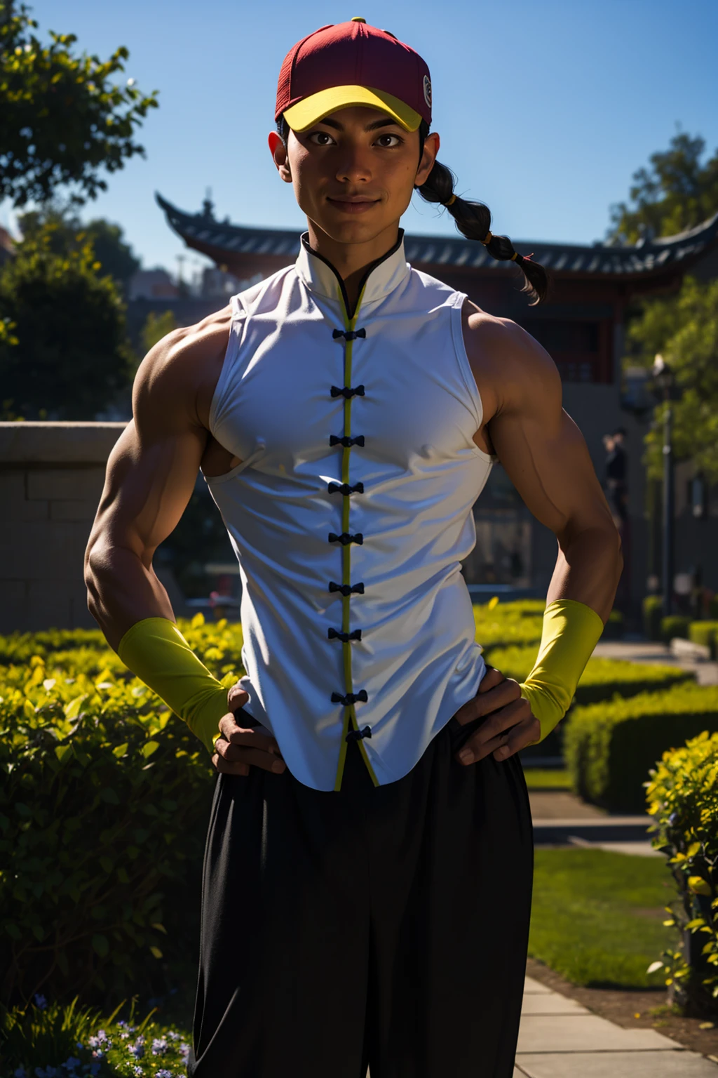 also: trucker cap, single braid, turtle neck, sleeveless shirt, chinese clothes, sleeveless changshan, fingerless gloves, baggy pants, black pants