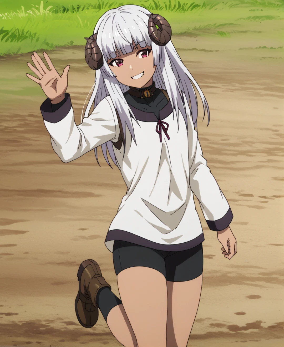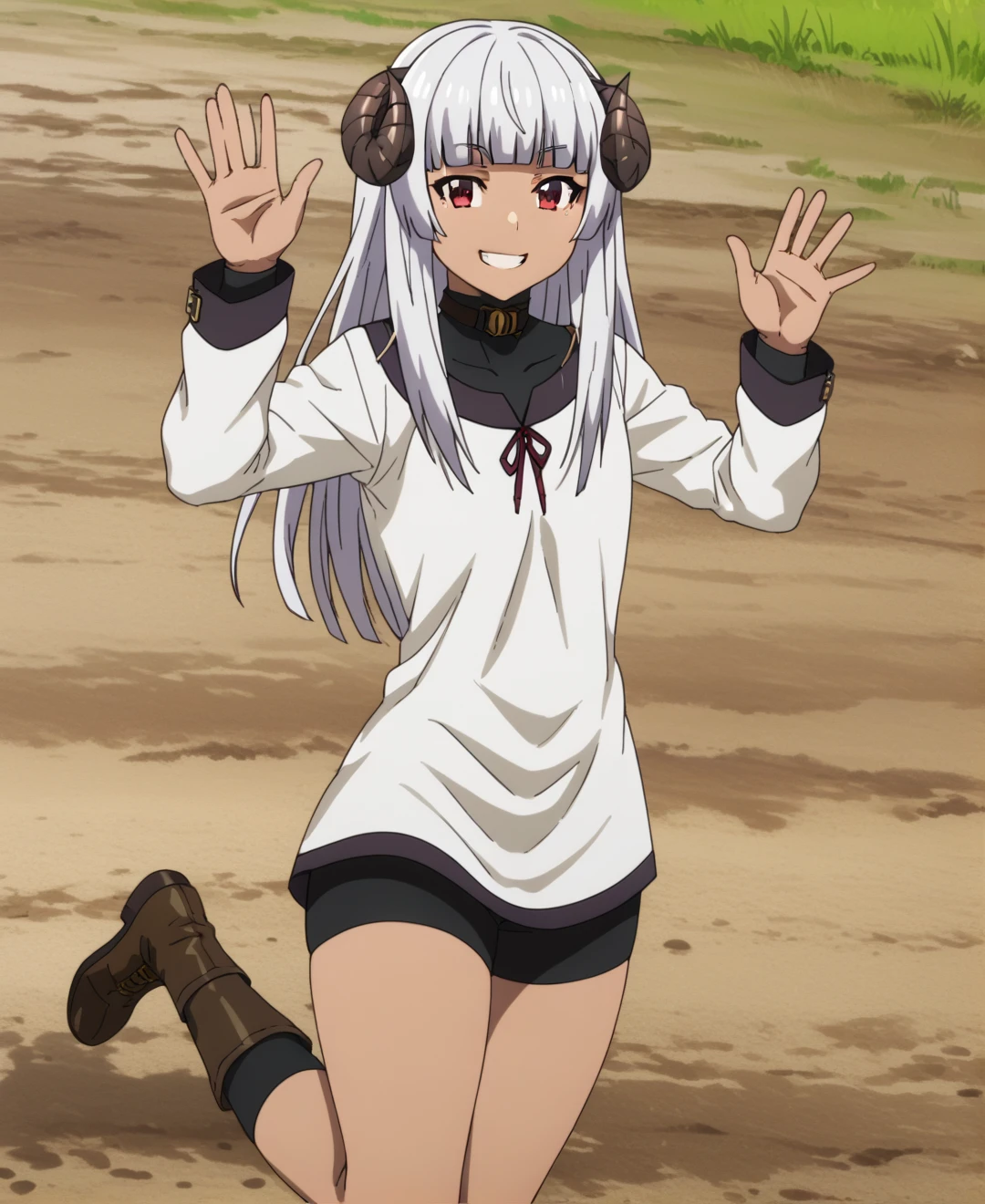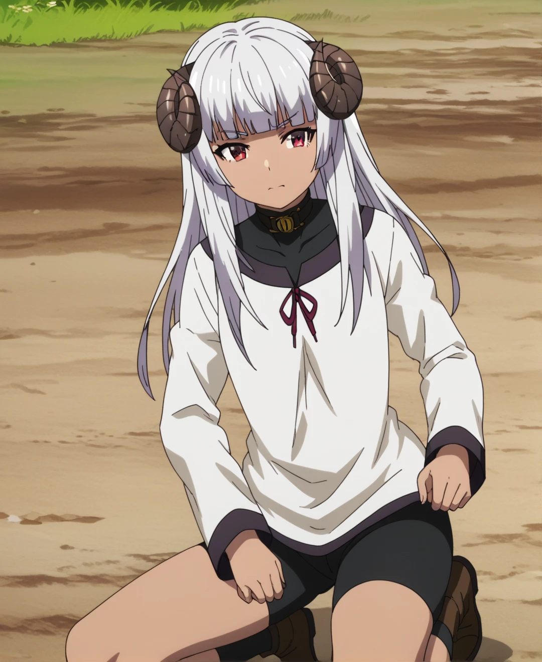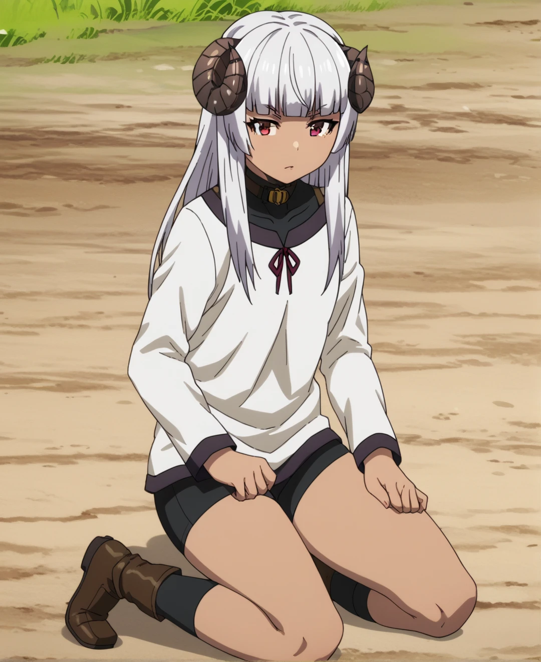 Felm, 1girl, solo, horns, long hair, red eyes, white hair, dark-skinned female, dark skin, sheep horns, blunt bangs,