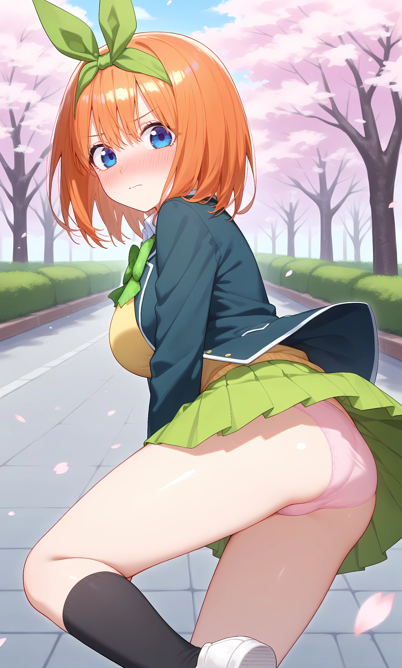nakano yotsuba, orange hair, green ribbon, hair ribbon, hair between eyes, blue eyes, medium hair