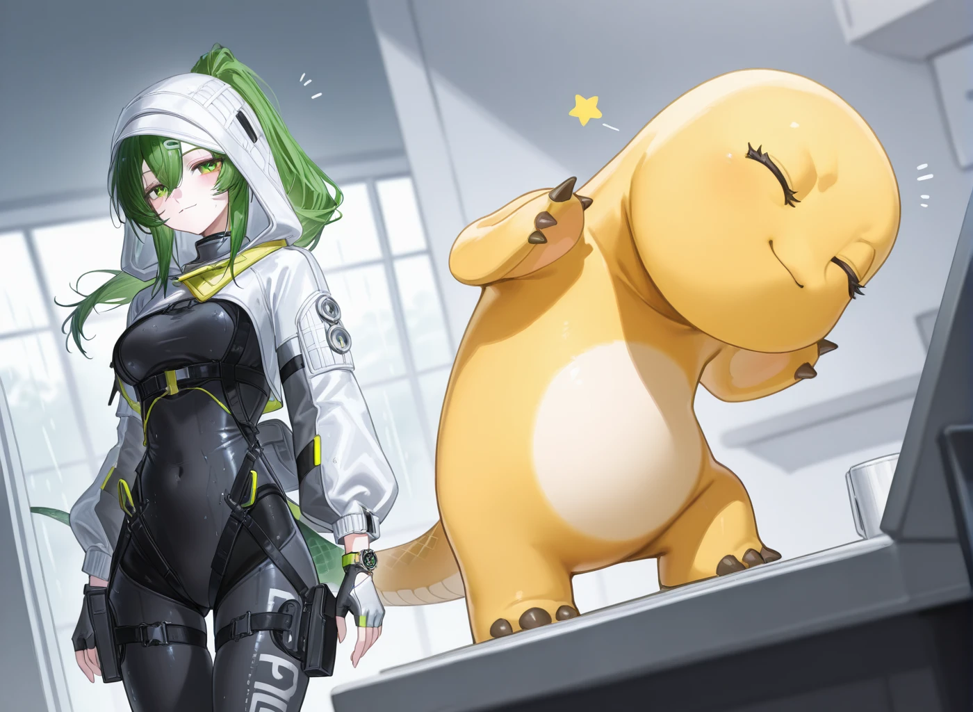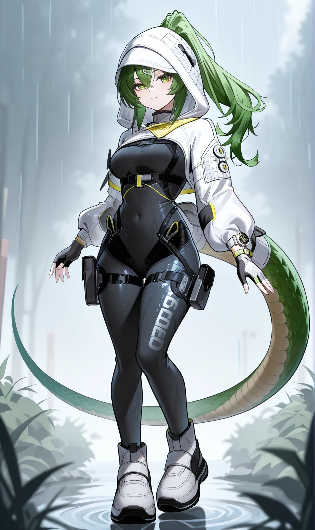 fluorite, 1girl, hairclip, wristwatch, green hair, high ponytail, hair between eyes, hair through hood, green eyes, white hood, hood up, snake tail, white shrug, black bodysuit, white gloves, fingerless gloves, thigh pouch, rain boots,