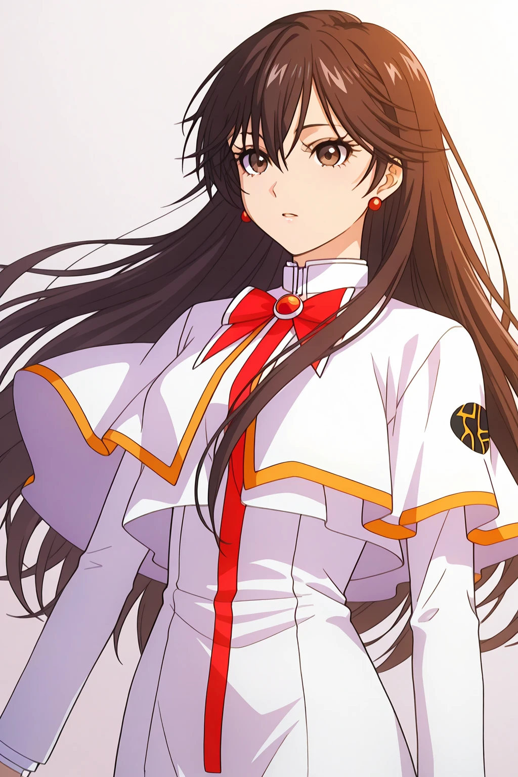 Akira E. Ferrari, long hair, eyelashes, brown hair, brown eyes, hair between eyes, earrings, uniform, short sleeves, sailor collar, sailor shirt, himeya company uniform, dress, white dress, long dres