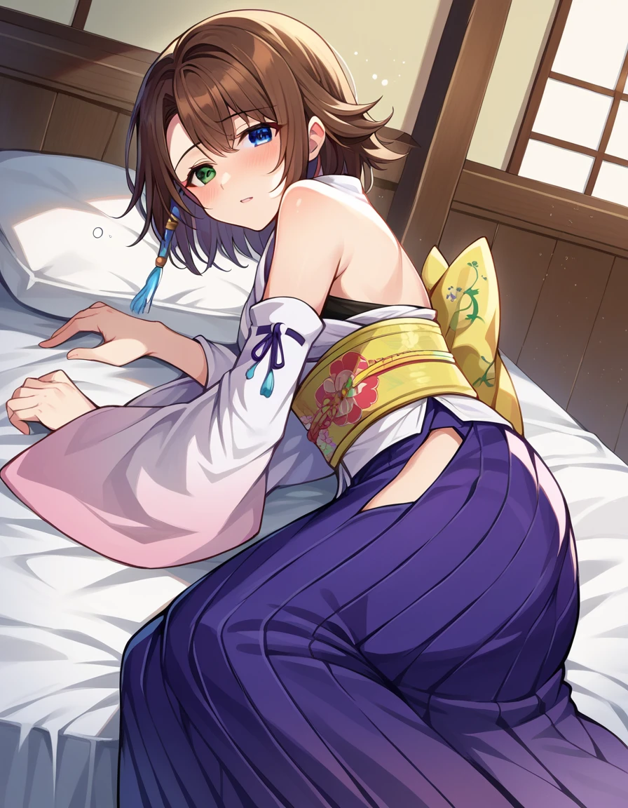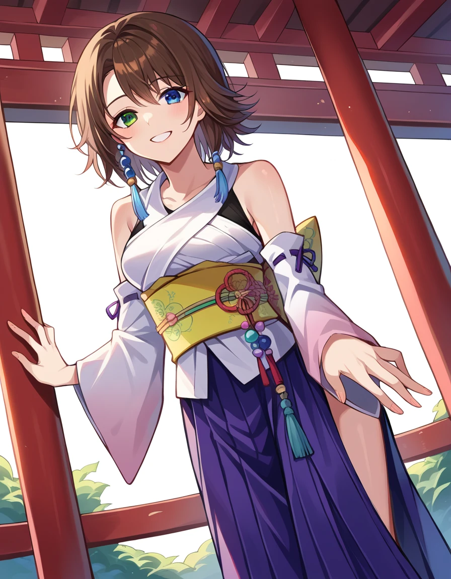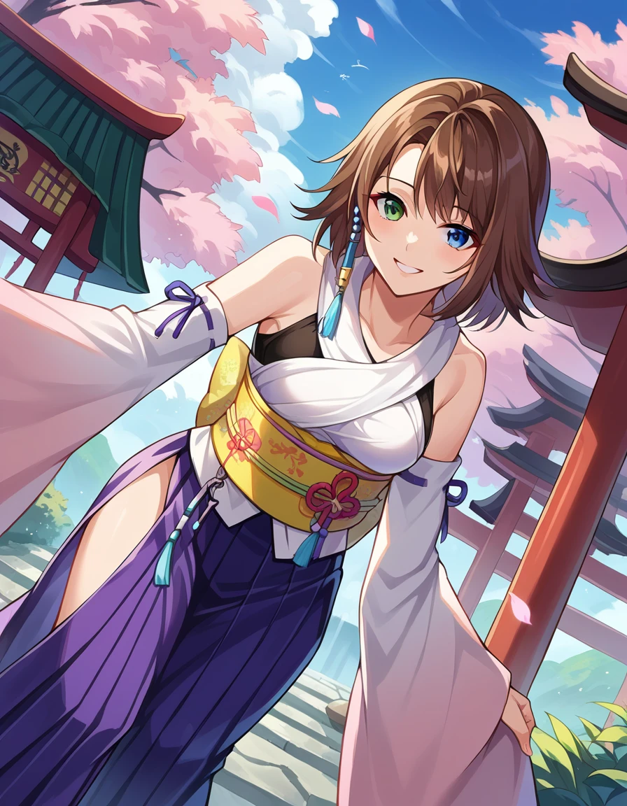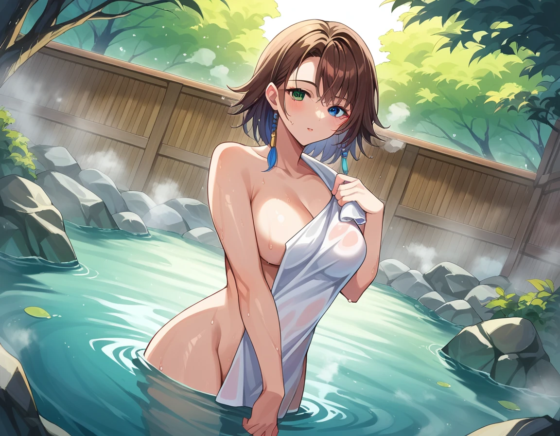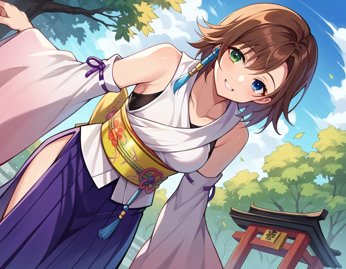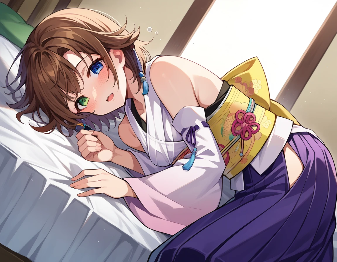 yuna, blue eyes, brown hair, green eyes, hair ornament, heterochromia, short hair,