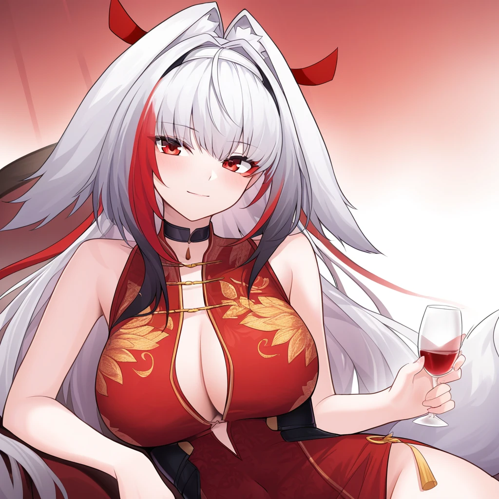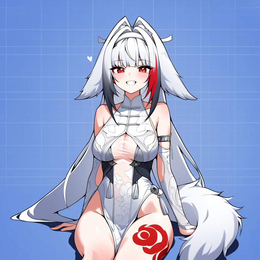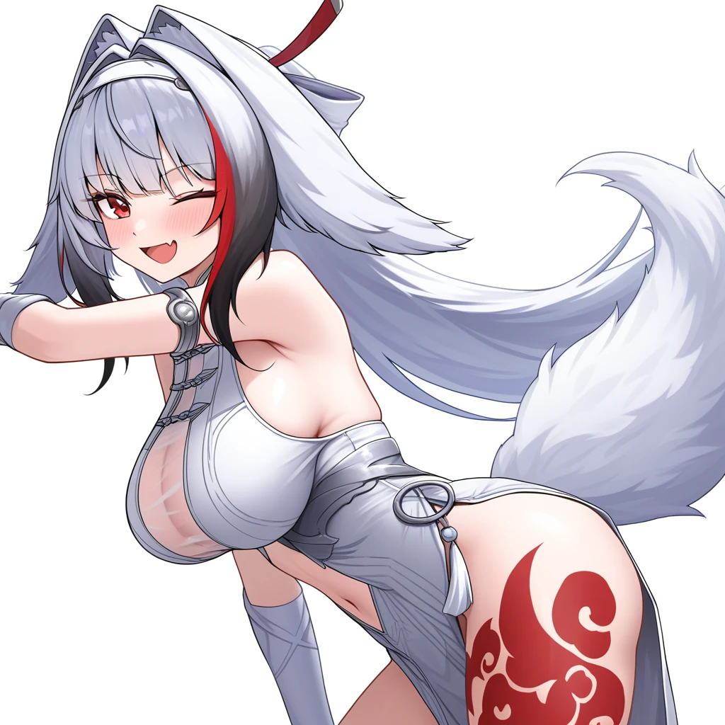 Appearance: 1girl, large breasts, red eyes, animal ear fluff, droopy ears, very long hair, streaked hair, gradient hair, hair intakes, multicolored hair, red streaks, white hair, black hair, white hairband, white tail, fluffy tail