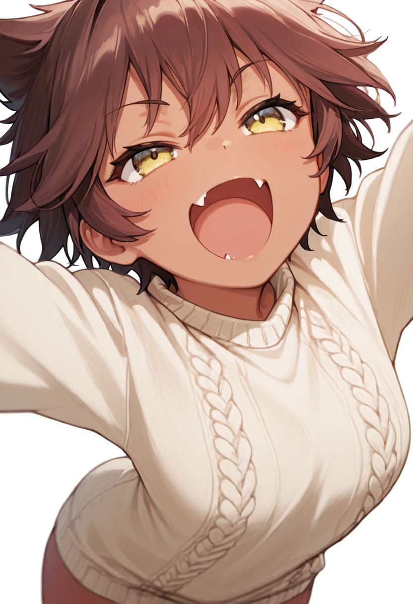 renren_cnr, 1girl,brown hair, short hair, fang, yellow eyes, dark-skinned female,