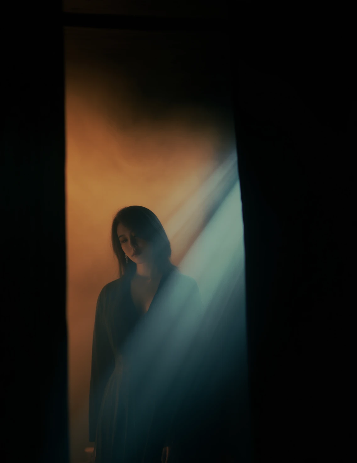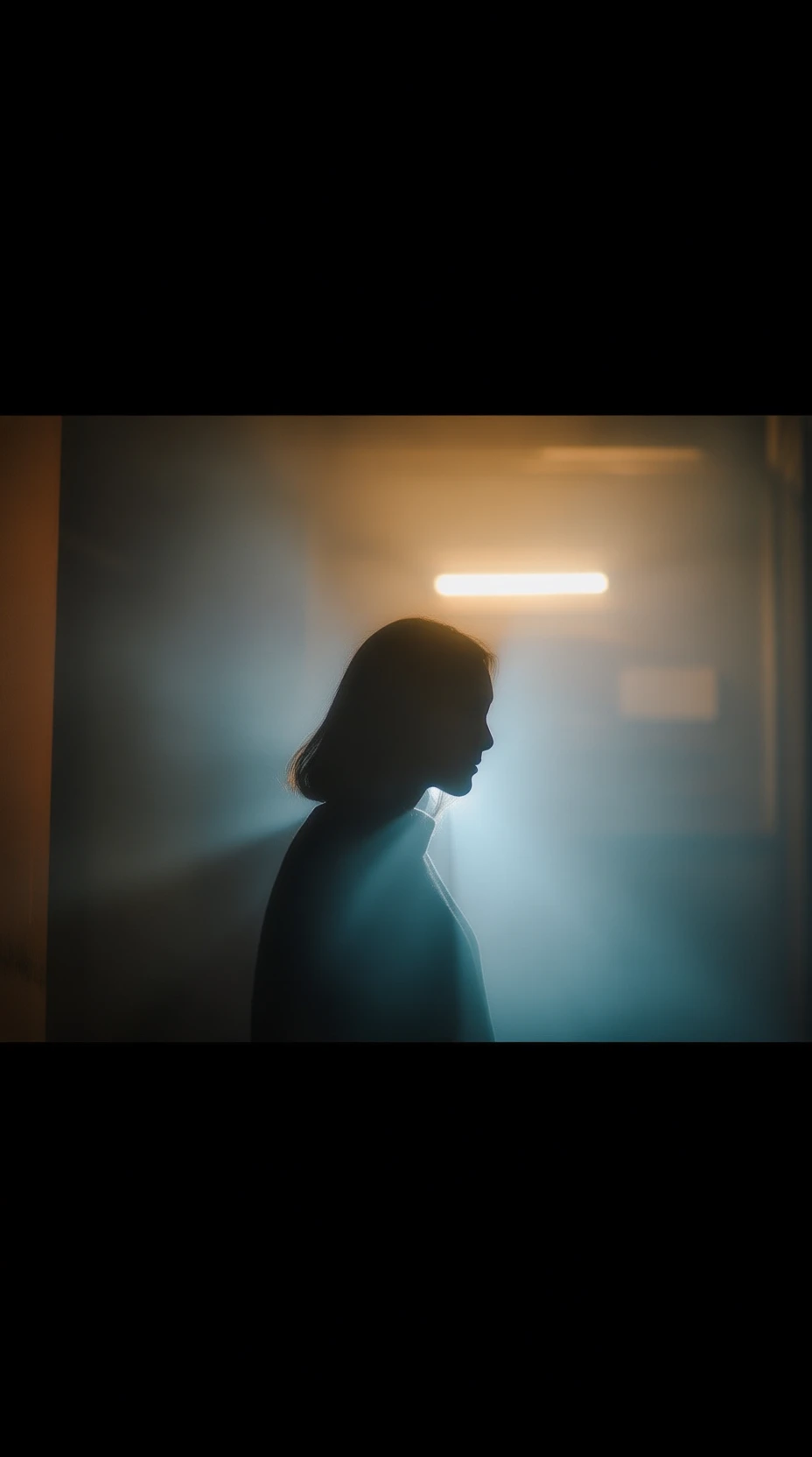A moody atmosphere with cinematic lighting, dramatic chiaroscuro shadows, soft light beams, and a dimly lit background. Warm and cold color contrast, mysterious and melancholic ambiance, with smoke and haze adding emotional depth.