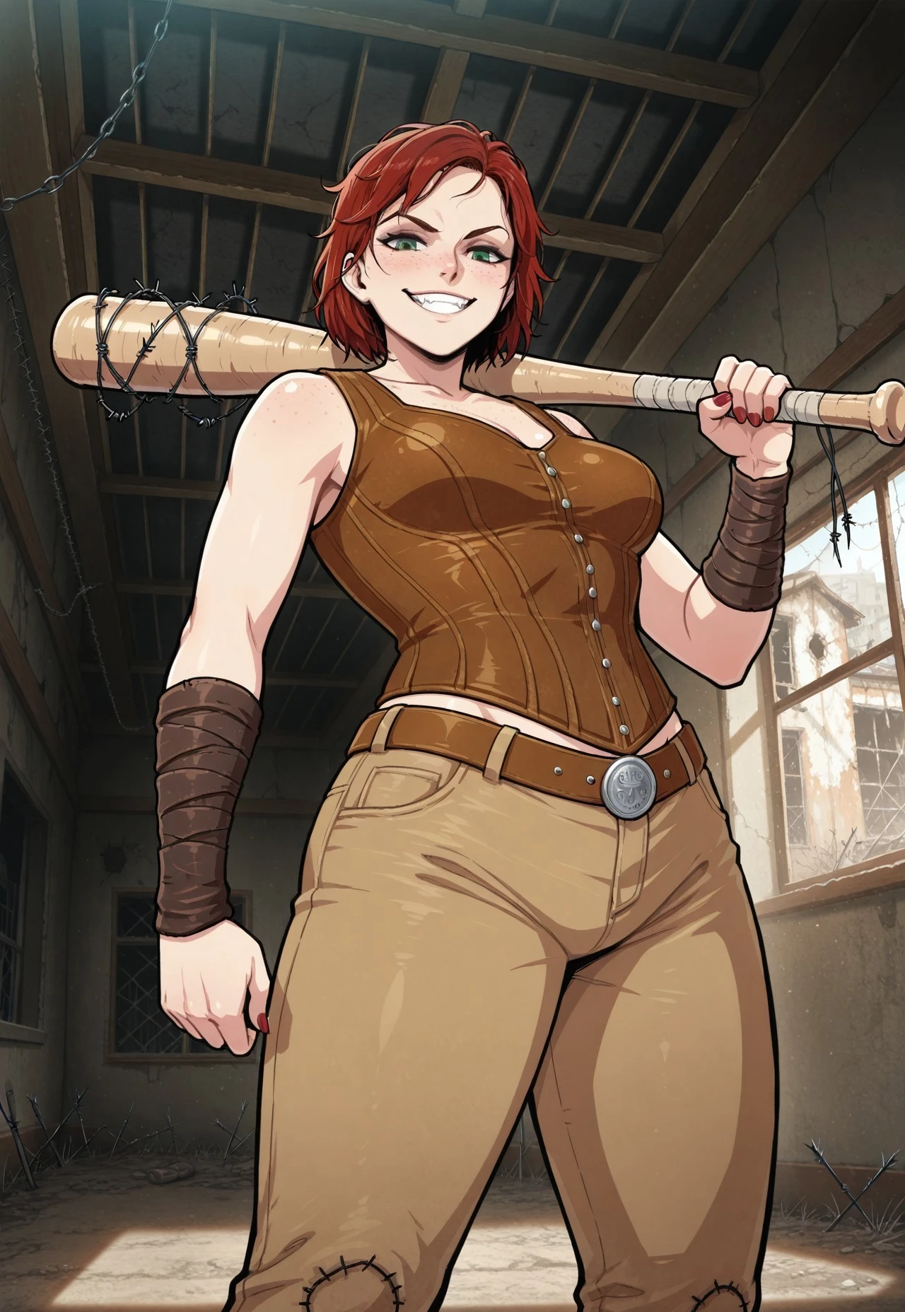 1girl, cait, solo, red hair, green eyes, freckles, short hair, messy hair, brown corset, leather arm wrap, belt, pants