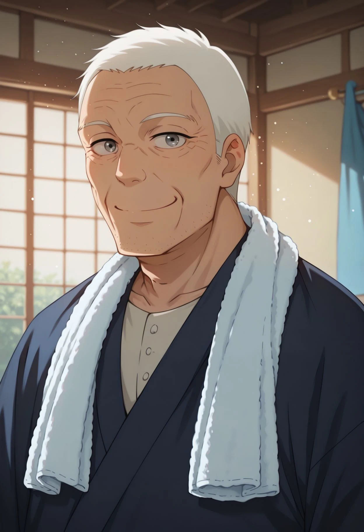 - Basic prompt: gojou kaoru, 1boy, old man, white hair, short hair, grey eyes, japanese clothes, blue kimono, blue pants, beige shirt