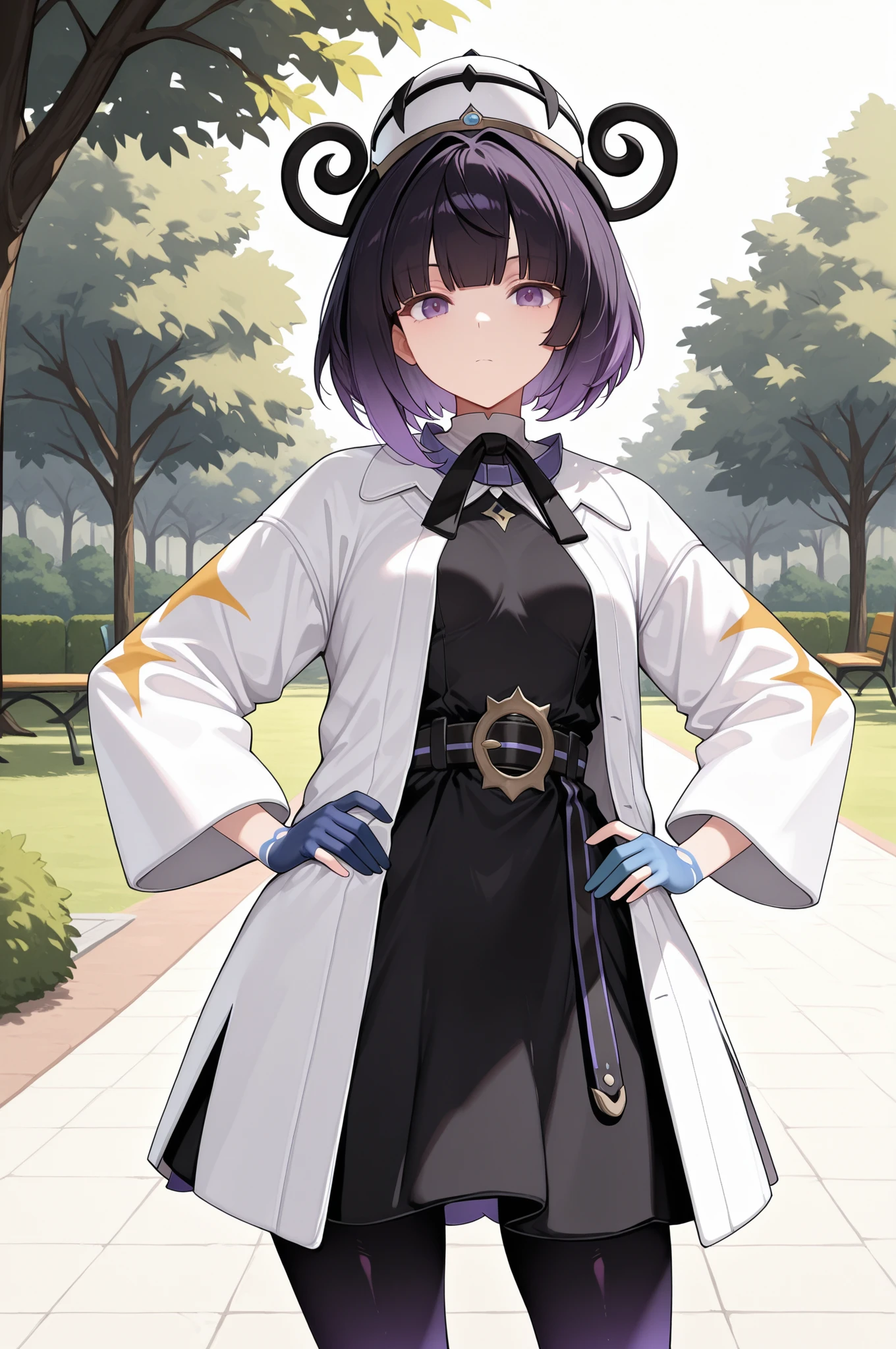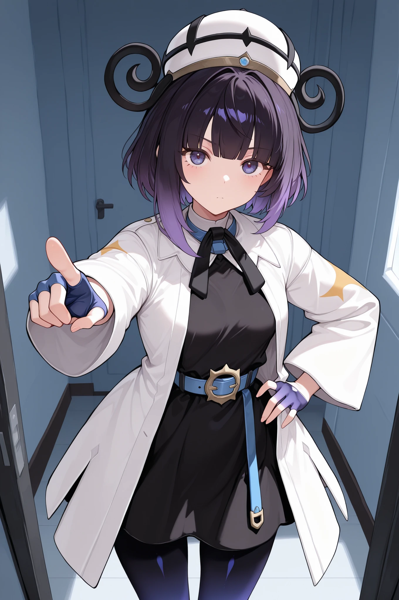 hat, black dress, white coat, blue gloves, partially fingerless gloves, belt, buckle, gradient pantyhose,