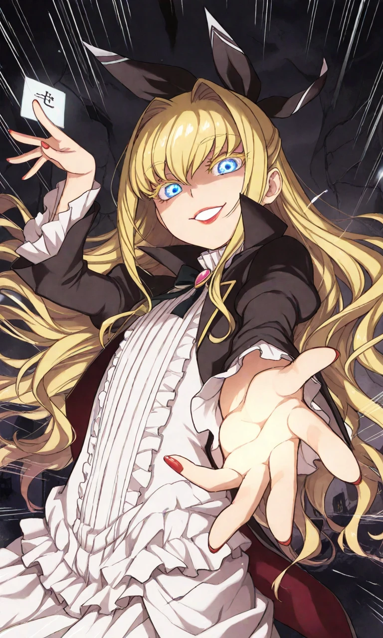 (dumb_ceres7th,1girl,blond hair,very long hair,colored eyelashes,blue eyes,bright eyes,black ribbon),