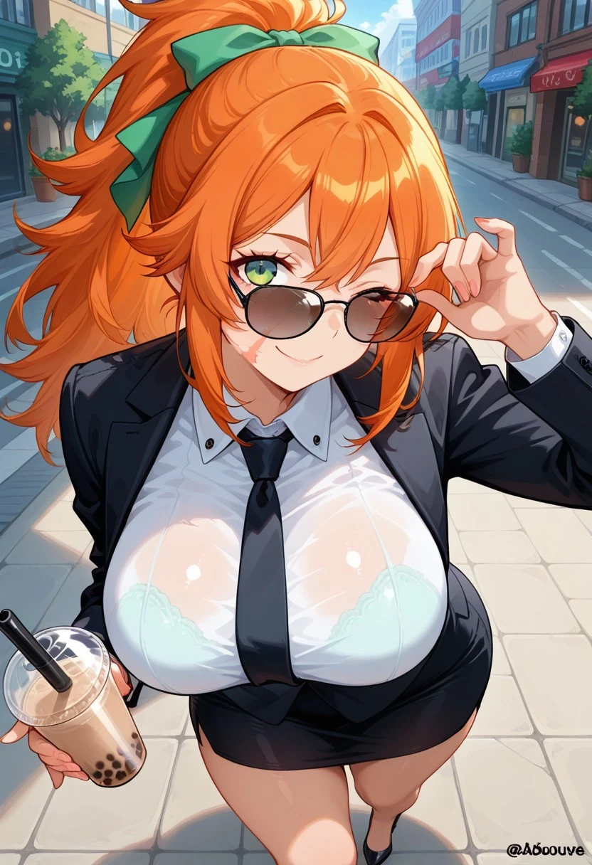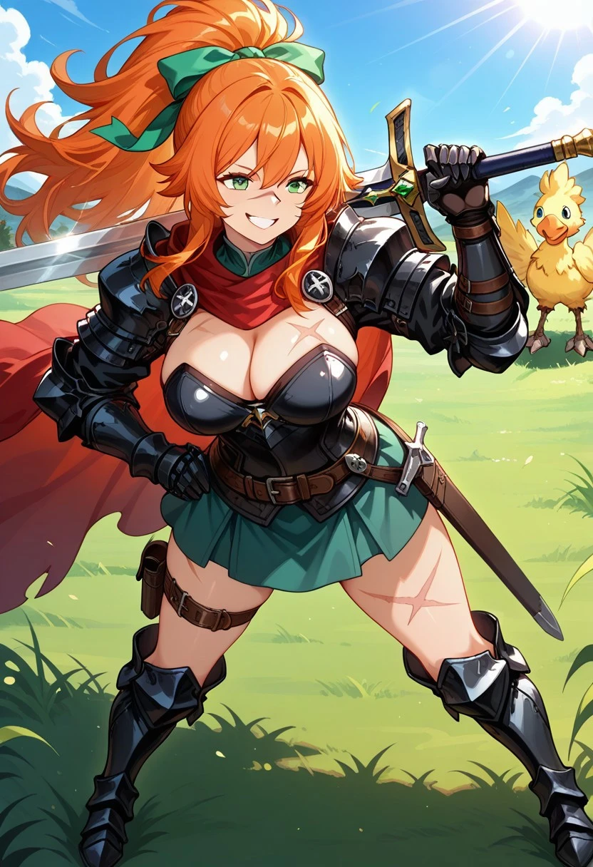 1girl,solo,mature woman,Lilyth,green eyes,orange hair,scar on face,long hair,ponytail, hair ribbon, green ribbon, tan-skin, large breasts,