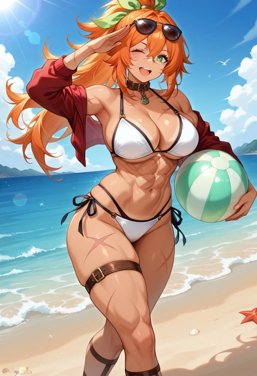swimsuit, white bikini, cleavage, side-tie bikini bottom, string bikini, bra belt, scar on arms, scar on thighs, collar, thigh strap, red sleeve shoulders, sunglasses, eyewear on head, muscular, abs, thigh sandals,