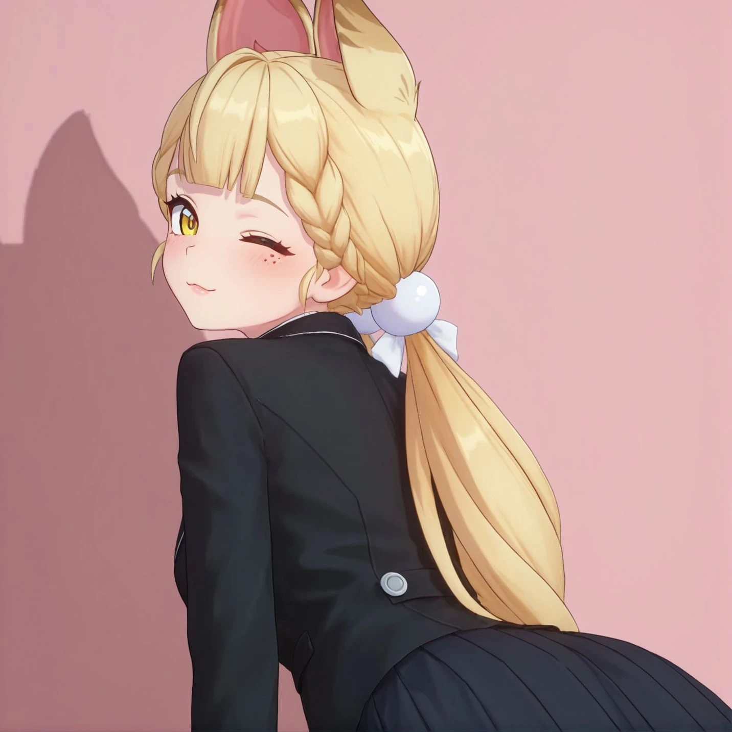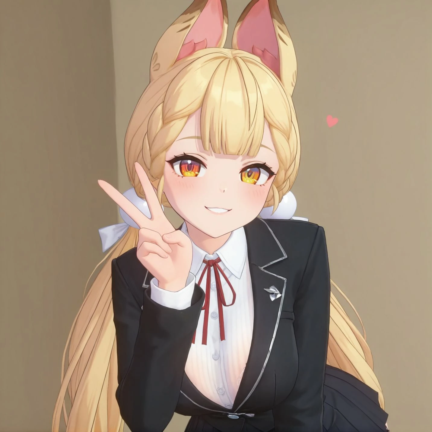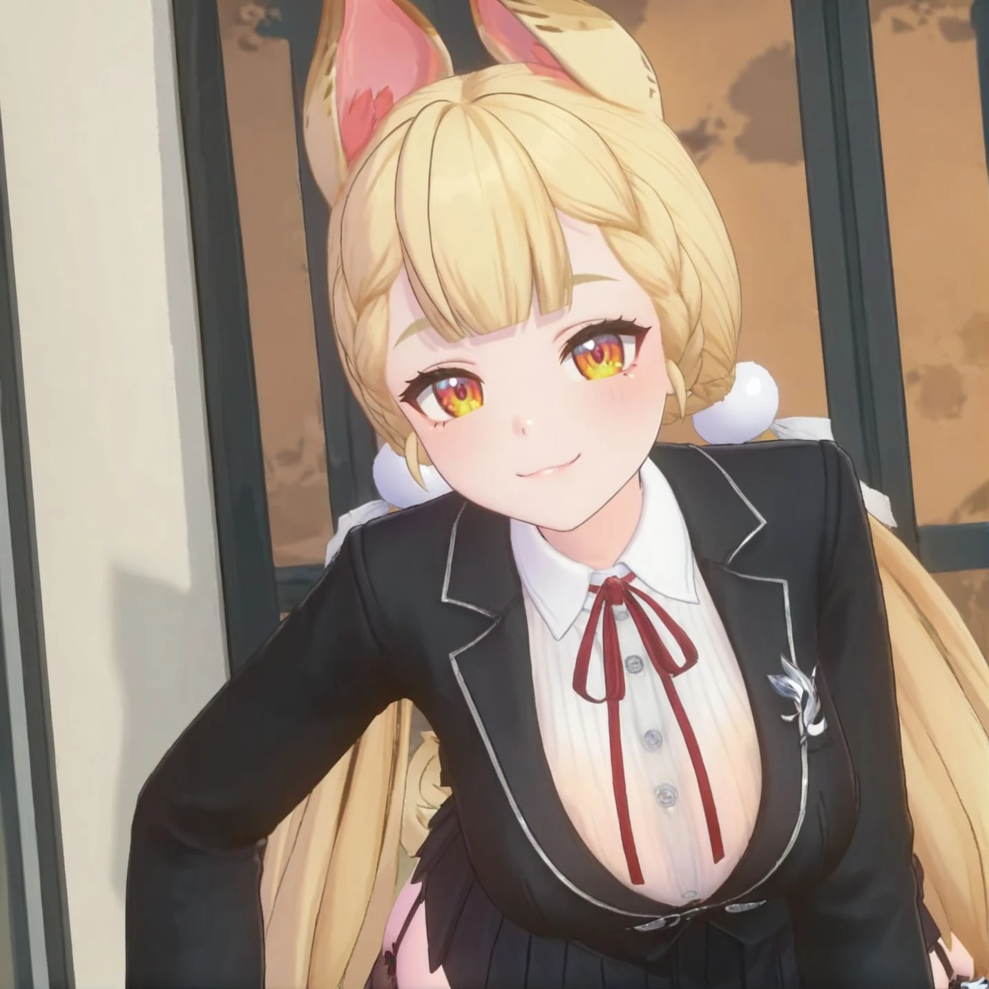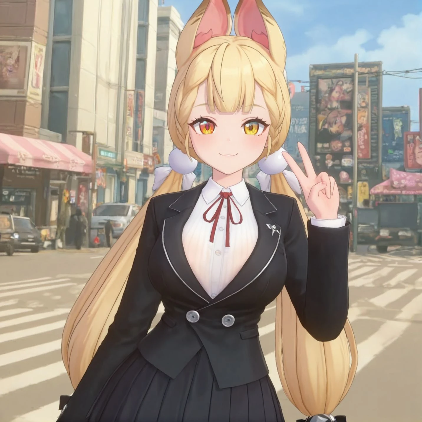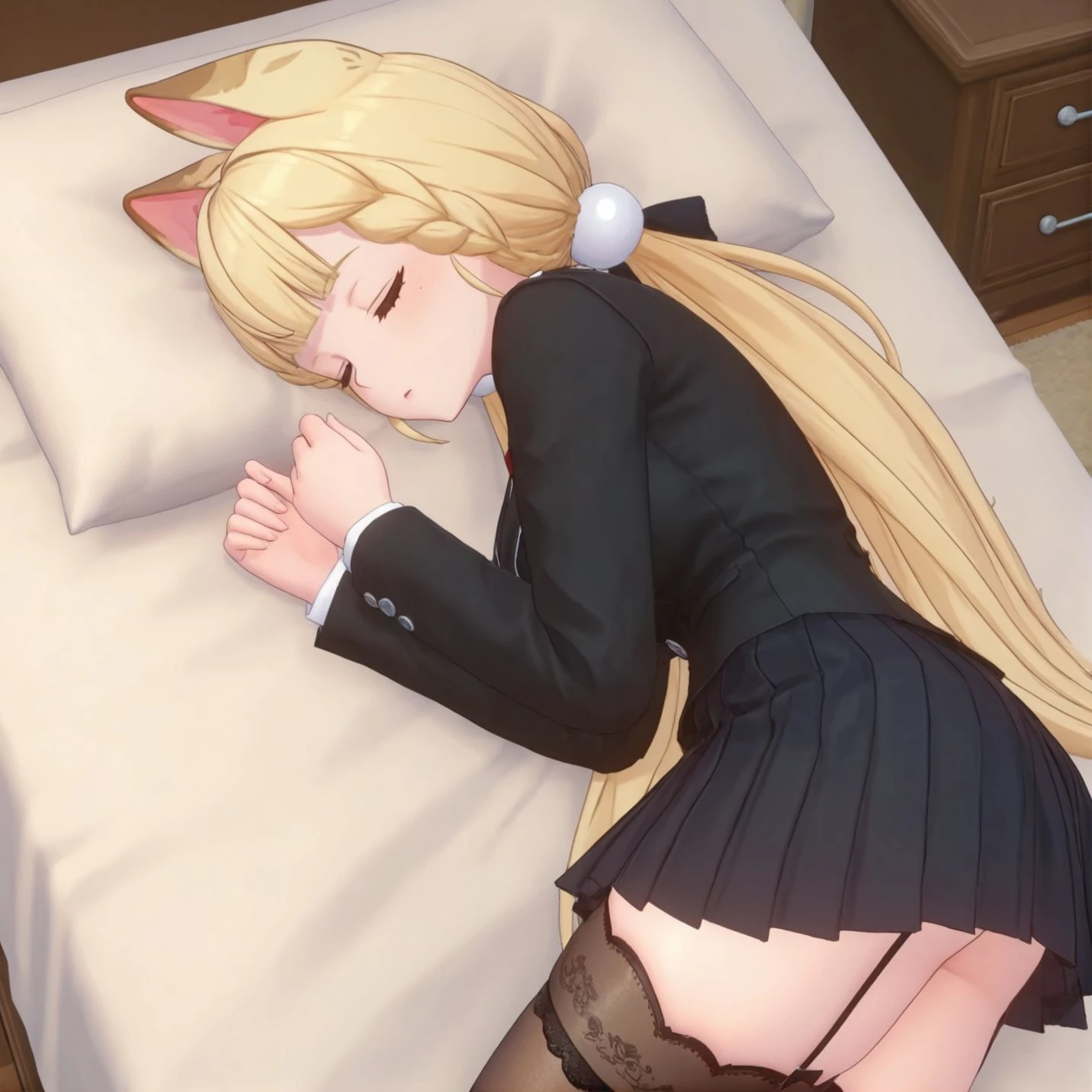 alice_zzz, black pleated skirt, black jacket, stockings, holding sword, cat ears, garter straps, hair ornament, long blonde hair, bangs, yellow eye, orange eye, collared shirt,