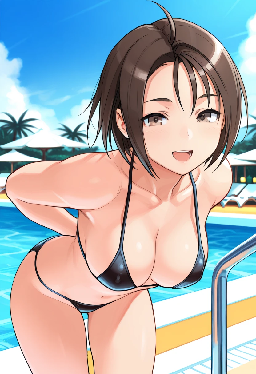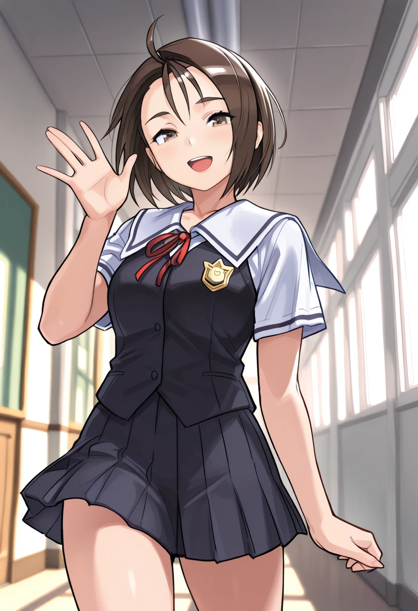 school uniform, white sailor collar, red ribbon, short sleeves, black vest, black pleated skirt, miniskirt, brown hair, ahoge, short hair, brown eyes