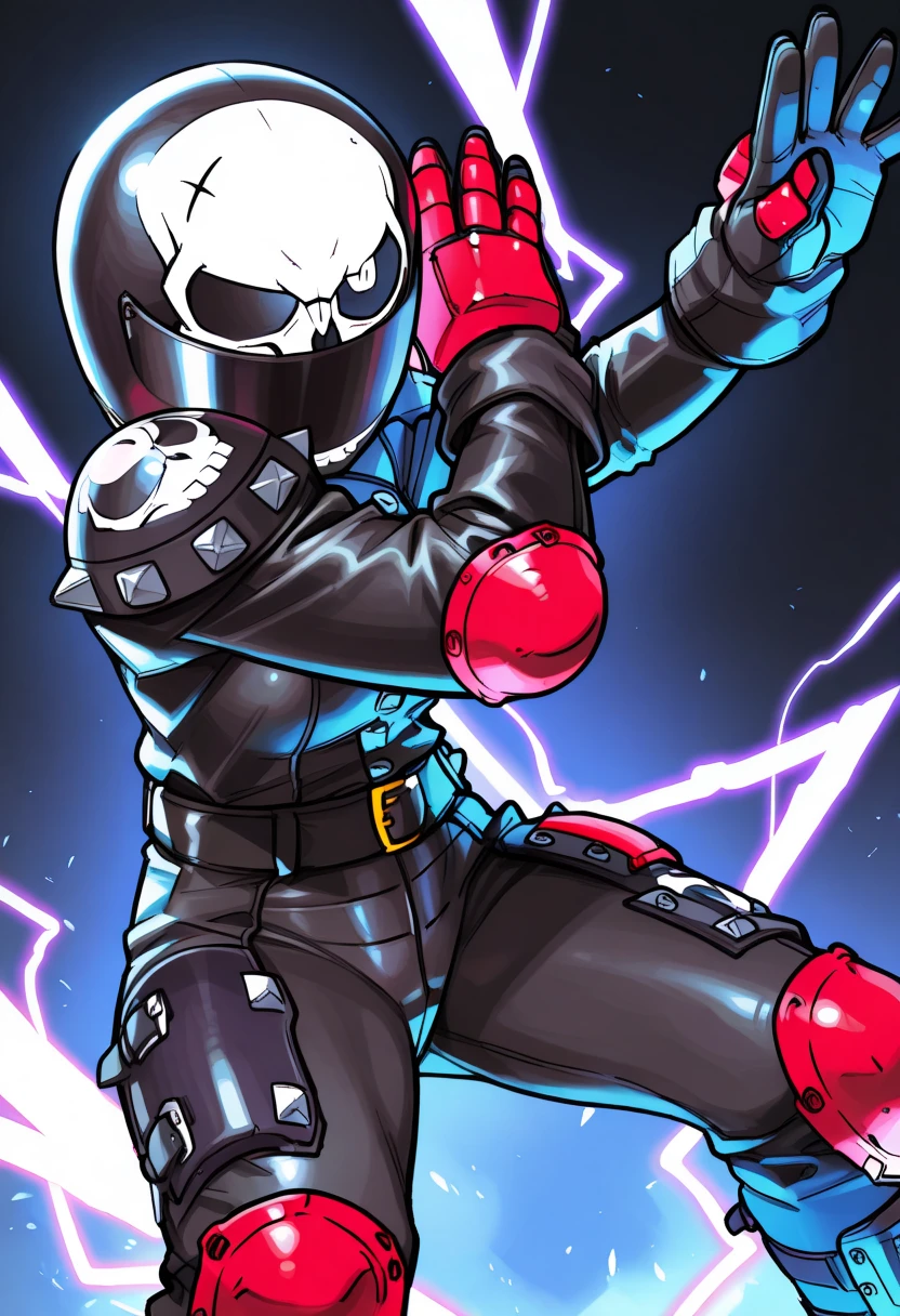 black bike suit, long sleeves, red elbow pads, black pants, red knee pads, gloves, helmet, skull mask, no hair, skull print shoulder pads