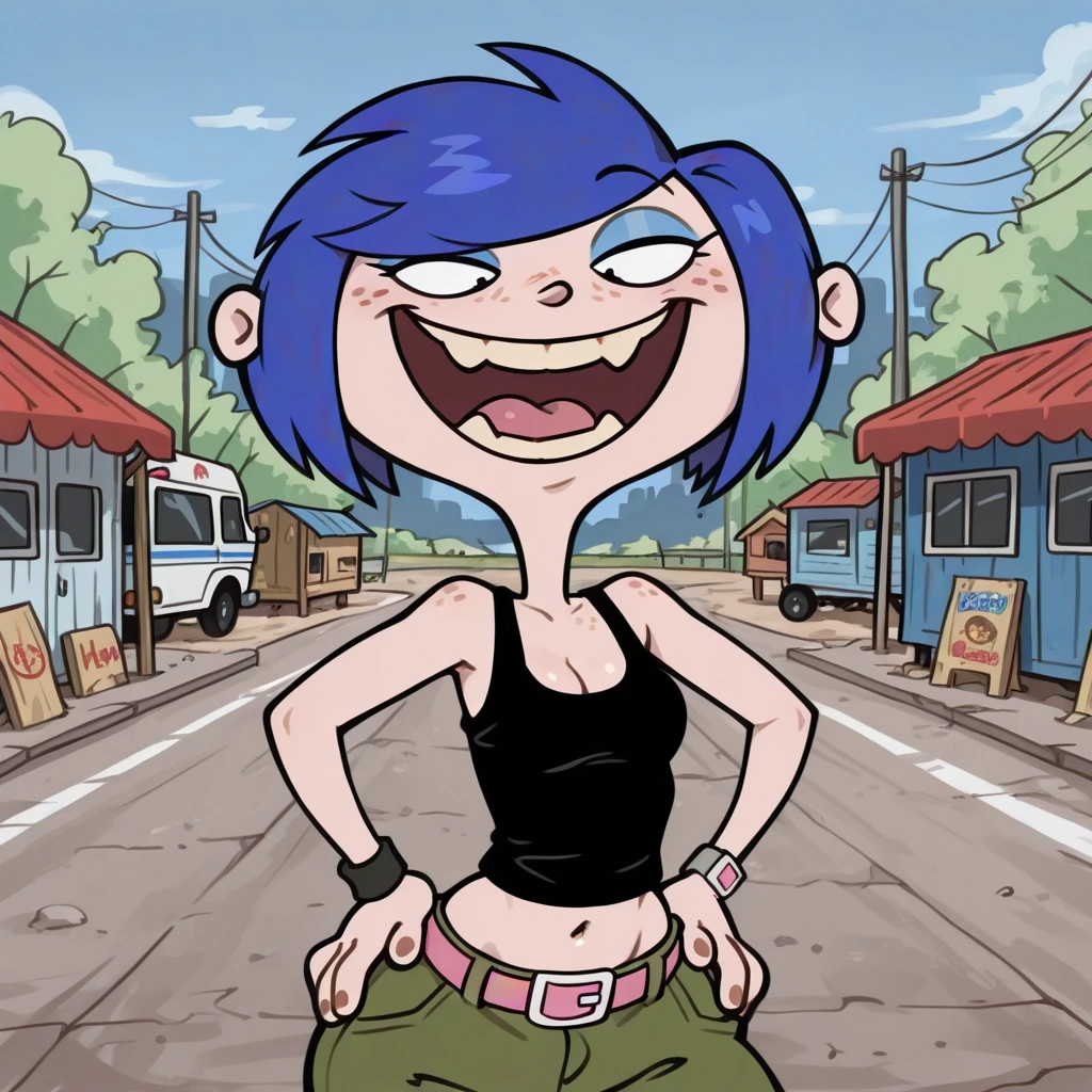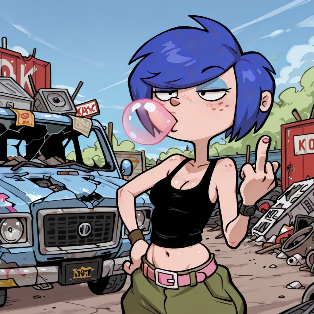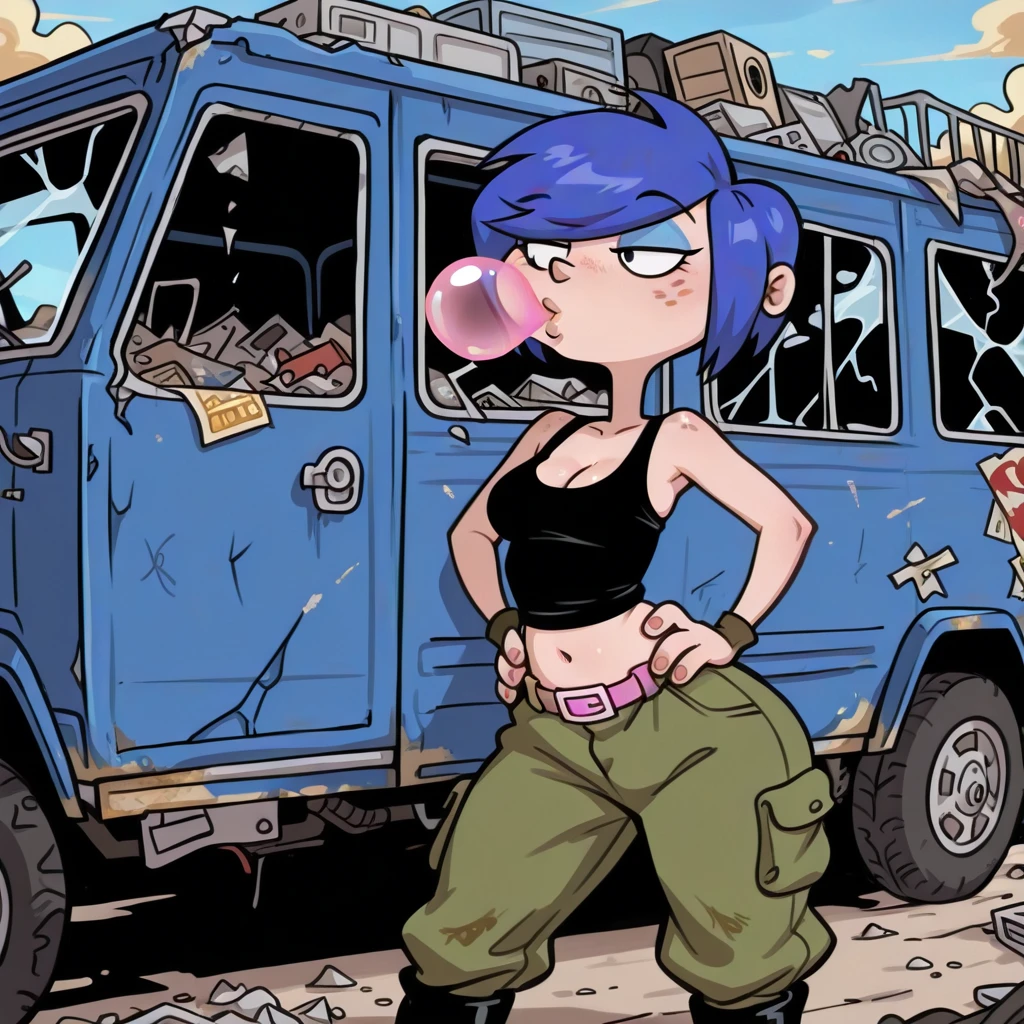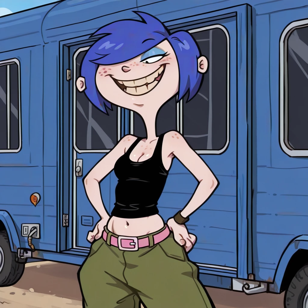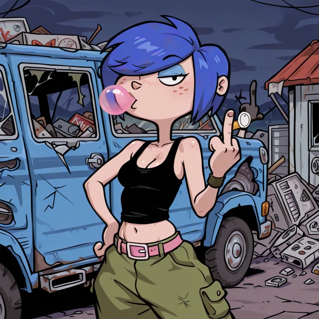 female, solo, curvy, cleavage, light skin, freckles, short blue hair, long bang over eye, black eyes, light blue eyeshadow, black tanktop, pink belt with white buckle, low-cut green baggy pants, navel, black boots,