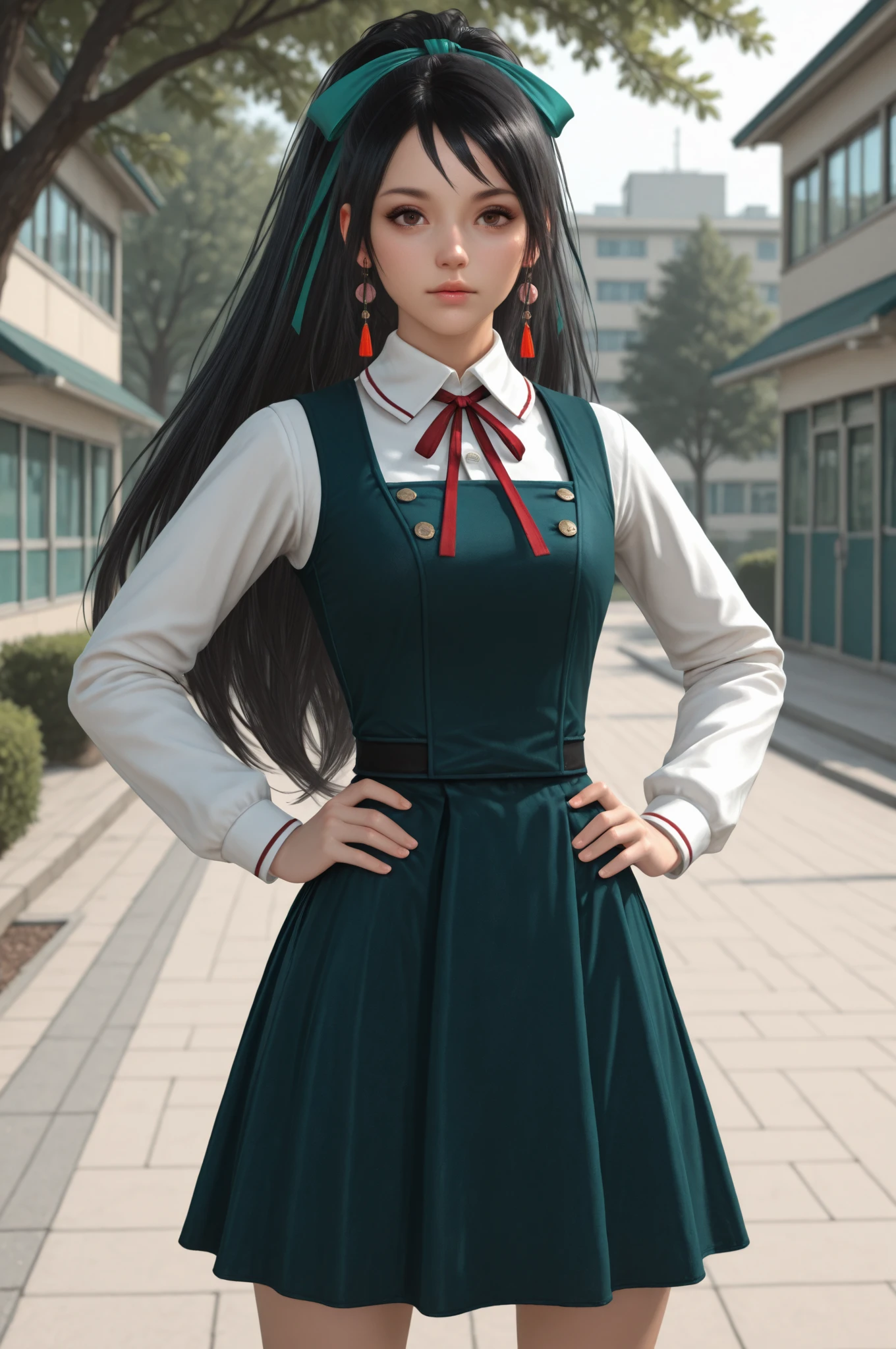 1girl, guanyinping_alt, long hair, black hair, ponytail, hair ribbon, brown eyes, earrings,