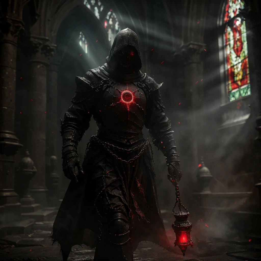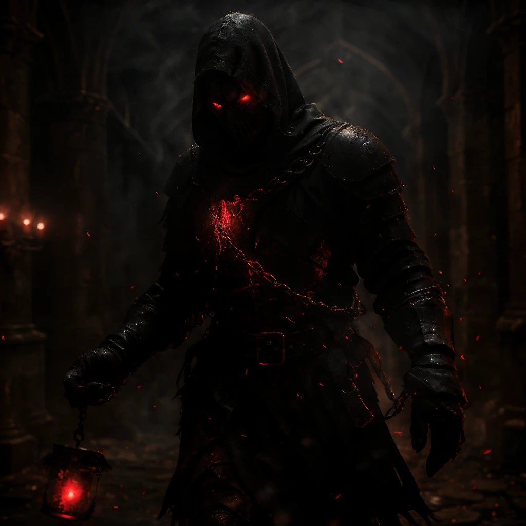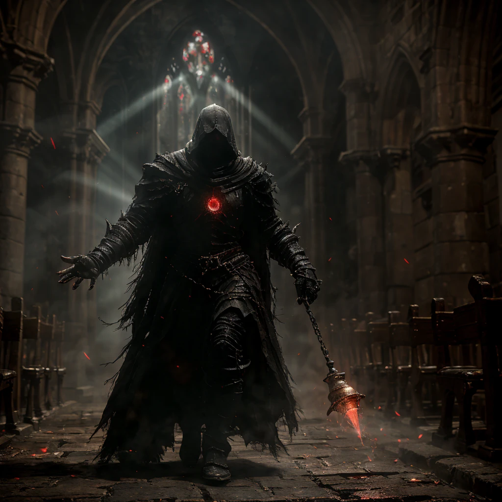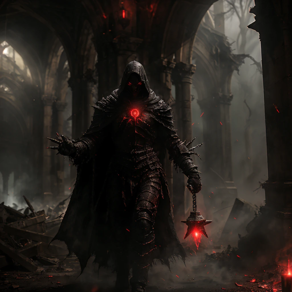 1other, armor, belt, black armor, blood, breastplate, cape, chain, chainmail, club, dual wielding, embers, facing viewer, fire, fog, full armor, full body, gauntlets, gloves, glowing, glowing eye, glowing eyes, gorkahn, helm, helmet, holding, holding sword, holding weapon, hood, hood up, indoors, looking at viewer, mace, male focus, mask, outdoors, pauldrons, red eyes, ruins, shoulder armor, smoke, solo, spiked club, spikes, standing, sword, thurible, weapon,Description
